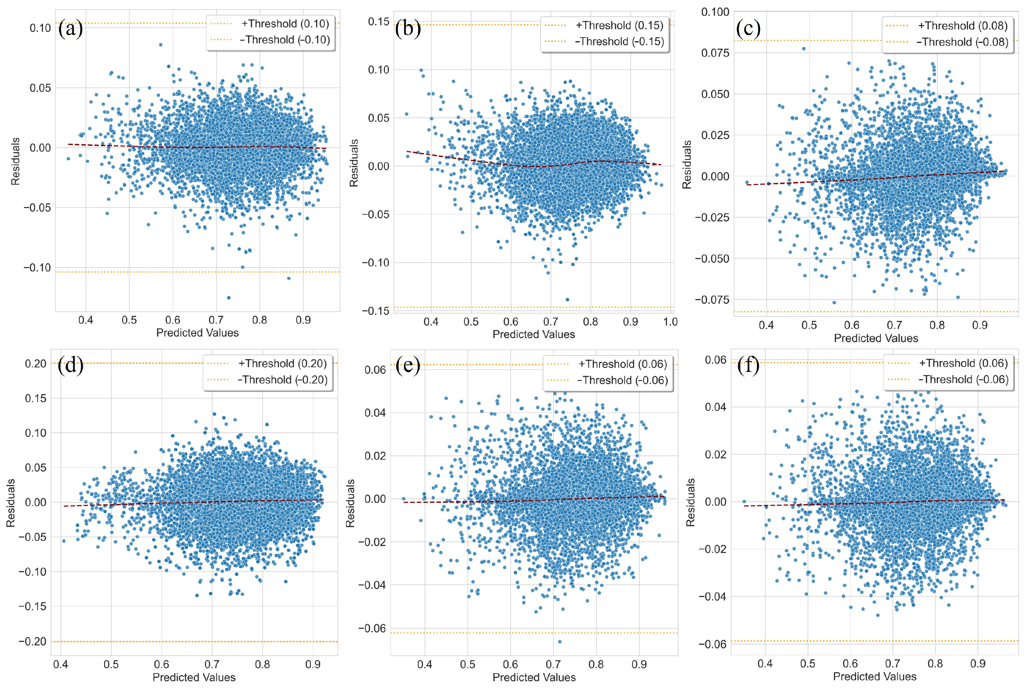 Figure 7 and Figure 8 illustrate the residual distributions of various models. The estimation residuals of the GFs-CatBoost model are concentrated within the range of [−0.05, 0.05]. Similarly, the residuals of the GFs-XGBoost model are also mainly distributed within [−0.05, 0.05], although there are individual residuals exceeding the threshold of 0.06. The peak densities of the residual histograms for both GFs-XGBoost and GFs-CatBoost models exceed 3500, indicating that the estimation errors for the vast majority of samples are minimal, with estimated values closely matching the true values. The residual distributions exhibit a unimodal and symmetric shape without significant skewness or outliers, suggesting that the errors follow a random noise pattern and the models do not exhibit systematic overestimation or underestimation. Further observation shows that the locally weighted regression curves almost coincide with the zero-residual line (y = 0), indicating that residuals do not display increasing, decreasing, or fluctuating trends with changes in estimated values, thereby validating the homoscedasticity and global consistency of the models. This distribution characteristic demonstrates that the models maintain stable fitting ability across the entire data domain, unaffected by noise or nonlinear relationships in specific regions. Overall, the models possess high accuracy and robustness, effectively supporting estimation tasks in practical scenarios.