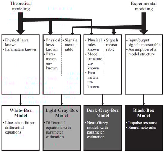For Control Theory to have a significant impact on industrial production systems, it is important that some research efforts focus on the pursuit of knowledge in real-world problems. From this perspective, understanding the dynamics of a system becomes essential, since the main factor of interest concerning system modeling is its practical use and utility for the personnel in charge. Some advantages of this include the ability to perform plant testing during the design stage, the possibility of using the model for operator training, and the opportunity to experiment via simulation with hardware improvements or control system enhancements before final approval. The use of knowledge to construct a mathematical model requires making assumptions based on principles of physics and chemistry. From the implications derived from such studies, it is possible to obtain a set of ordinary or partial differential equations. This leads to the development of a theoretical mathematical model with a defined structure and parameters, which in most cases is difficult to solve. However, there are ways to avoid the complications of a theoretical model, and one of them is through experimental analysis using identification methods, which result in a mathematical model derived from the measurement of the input and output of the system []. It is important to emphasize that although theoretical mathematical models are elegant, they involve significant effort and often face practical challenges in industrial applications, such as: they tend to be complex even for simple systems and can be time-consuming to develop; theoretical coefficients are not exact, as system parameters tend to change over time due to usage; there are unmodeled dynamics that are omitted, making the mathematical model incomplete, among other issues. According to [], Figure 1 shows a way to classify systems.