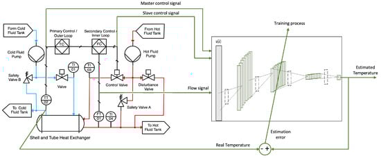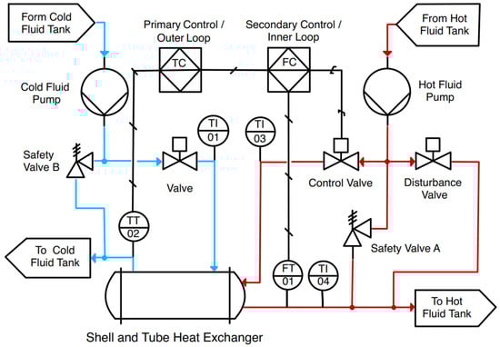 According to the experimental system [], Figure 2 shows a control system based on the cascade control strategy, where the main function is to maintain the temperature in the shell and tube heat exchanger. To achieve this, the system is composed of two pumps responsible for recirculating a hot fluid and a cold fluid, respectively. Safety valves are included in case of overpressure in the pipeline. In addition, primary measuring instruments are installed, including temperature indicators, a temperature transmitter with an analog voltage signal, and a flow transmitter that also has an analog voltage signal. The system includes a control valve and a disturbance valve located at the pump discharge in the hot fluid pipeline. The cold fluid pipeline only includes a valve for system alignment.