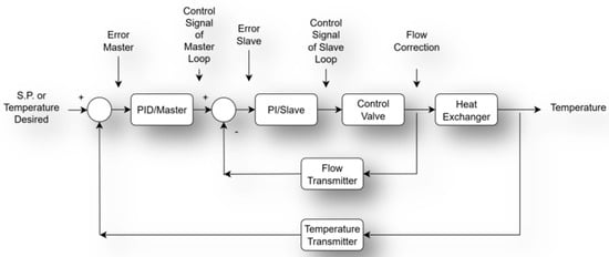 The operation of the system focuses on a cascade-type control system, where two nested control loops are present. The outer control loop is known as the primary or leader control loop, and the inner control loop is known as the secondary or follower control loop. In this control strategy, it is necessary for the controlled variable (leader loop) to have slower dynamics compared to the manipulated variable (follower loop). For the case study considered in this work, this condition is met by having temperature as the controlled variable and flow as the manipulated variable. The control philosophy is based on the idea that once a Set-Point achievable by the system is selected and compared with the temperature acquired directly by the temperature transmitter installed in the shell and tube heat exchanger, the error signal of the leader control loop is obtained. This signal is then used by the primary controller, which in most cases according to the literature and successful cases reported in the industry, is a PID/PI controller. This signal functions as a Set-Point for the follower control loop, where it is compared with the signal acquired by the flow transmitter installed in the shell and tube heat exchanger. The error signal produced is used by a PI/P controller, and this control signal is sent to the final control element, which in this case is the control valve in the hot fluid pipeline. By reducing or increasing the flow of the hot fluid, it is possible to control the temperature of the fluid in a shell and tube heat exchanger. Figure 3 illustrates the control philosophy described.
