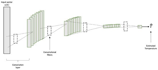 One of the main contributions of this paper is that no fully connected layer is used as the output layer; instead, only convolutional layers are used. This is successfully performed by considering the correct amount of hyper-parameters of the CNN such as the number of filters, their size, the padding, and stride and size of the input vector. One more advantage is the inner noise reduction that CNN can do with the processed data. The training process is performed using the backpropagation algorithm; using offline data, this process is described in the next section. The estimation process is defined in Figure 5. Data from the real process are acquired and used as input to the CNN, generating the estimated temperature to be compared with the one obtained from the temperature sensor for the training process.