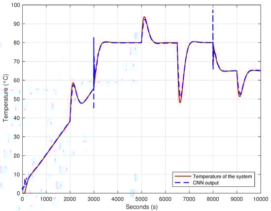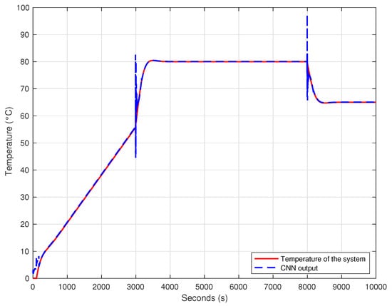 Similar simulations were carried out but this time the system output presents disturbance at four different moments and with different amplitudes, one occurring at 2000 s of 4 °C, one more at 5000 s of 7 °C, at 6500 s of 12 °C, and one last one at 9000 s of 3 °C. Estimation results are presented in Figure 7. As in the previous case, the estimation error obtained a high value when the reference changed drastically, but in other moments the CNN behaves the same as the real system.