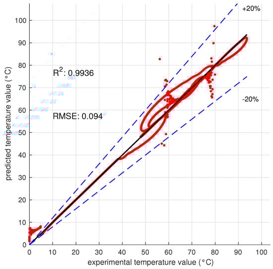 From these metrics, Figure 8 shows the behavior of the system comparing the pairs of data, estimation with the real value; for perfect fitting, each pair should be above the identity line. As is shown, at the beginning several points are outliers, this is due to the initialization of the CNN inputs, which requires around 200 data to be completed; this is only if considering there are no data to work with. After this point, there are around 10 points out of the 20% error lines in this estimation, which represents 0.1% of data used.