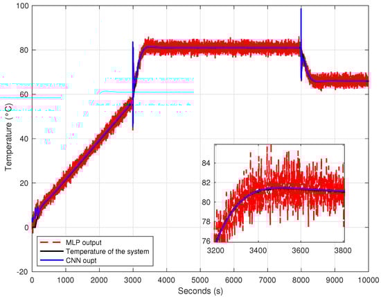 One of the main challenges in applying control or system identification algorithms in industrial environment is dealing with noisy signals: sensor failures, connection cable failures, external agents, etc. To overcome this problem, it is important to perform adequate signal processing to ensure a better performance of the controller or the system in general. One advantage of CNN over some other estimation algorithms is that it can internally reduce signal noise. In this regard, a comparison was made between the proposed CNN and a multilayer perceptron, using the aforementioned metrics to assess the efficiency of the proposed algorithm. A two-layer MLP is designed, with 100 neurons in the hidden layer and the same amount of input data. This approach is implemented because a significant amount of system information is also required for system estimation. It is trained using the backpropagation algorithm, using a learning rate of 0.5. Five training epochs are used, each with 10,000 training data points, which are different for the testing stage. Random numbers representing temperature variations within a range of are used to generate noise in the simulation; this is performed for both training and testing purposes.