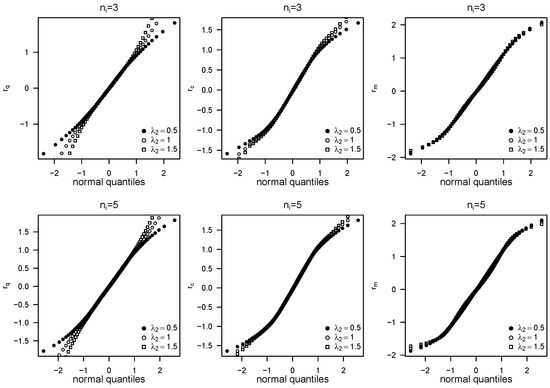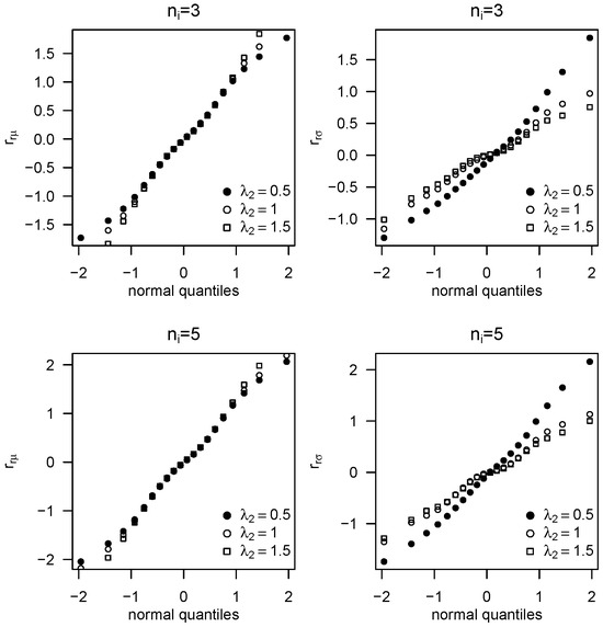 Figure 2 displays normal probability plots for the standardised random effect estimates and , with and . Both distributions are well approximated by the normal law. Similar plots were generated for , , and , and comparable results (not shown) were also obtained for and .