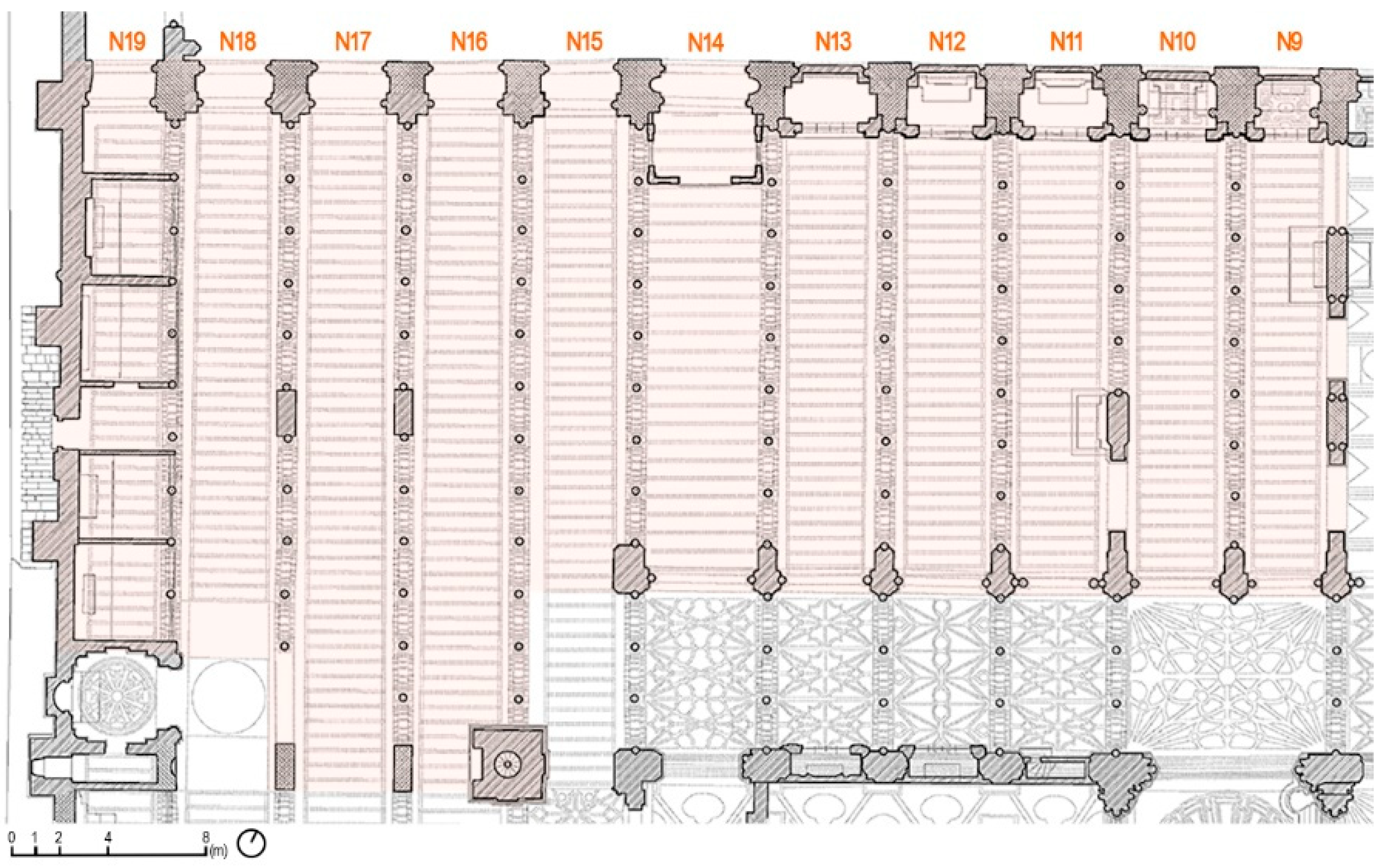 The specific sector analysed in this study belongs to the original mosque commissioned by Abd al-Rahman I in the VIII century. Located in the northwestern portion of the present-day prayer hall in
