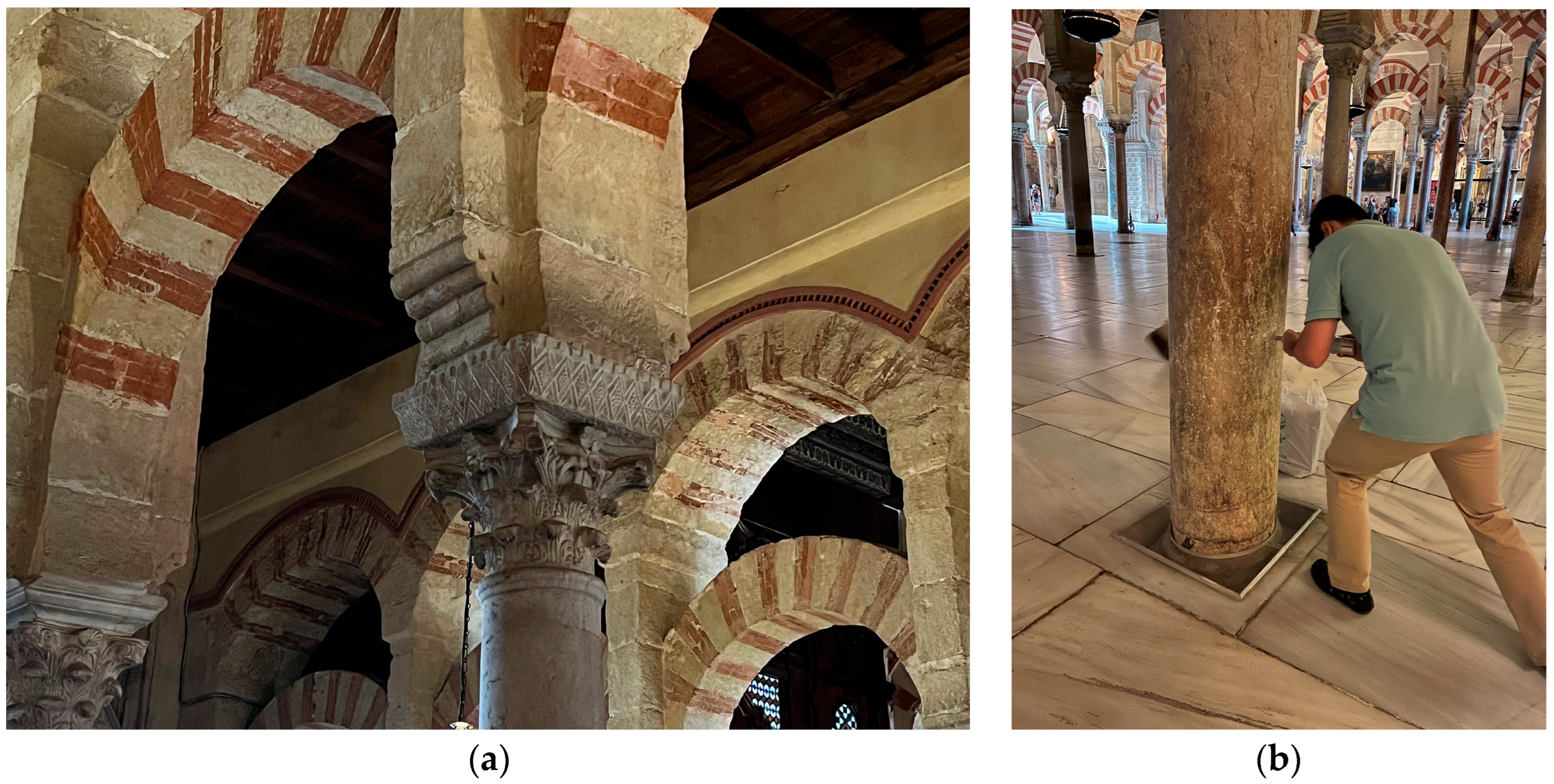 - Hidalgo Fernández, R.E.; Ortiz-Cordero, R. The Mosque-Cathedral of Córdoba: Evidence of Column Organization during Their First Construction s. VIII A.D. J. Cult. Herit. 2020, 45, 215–220. [Google Scholar] [CrossRef]