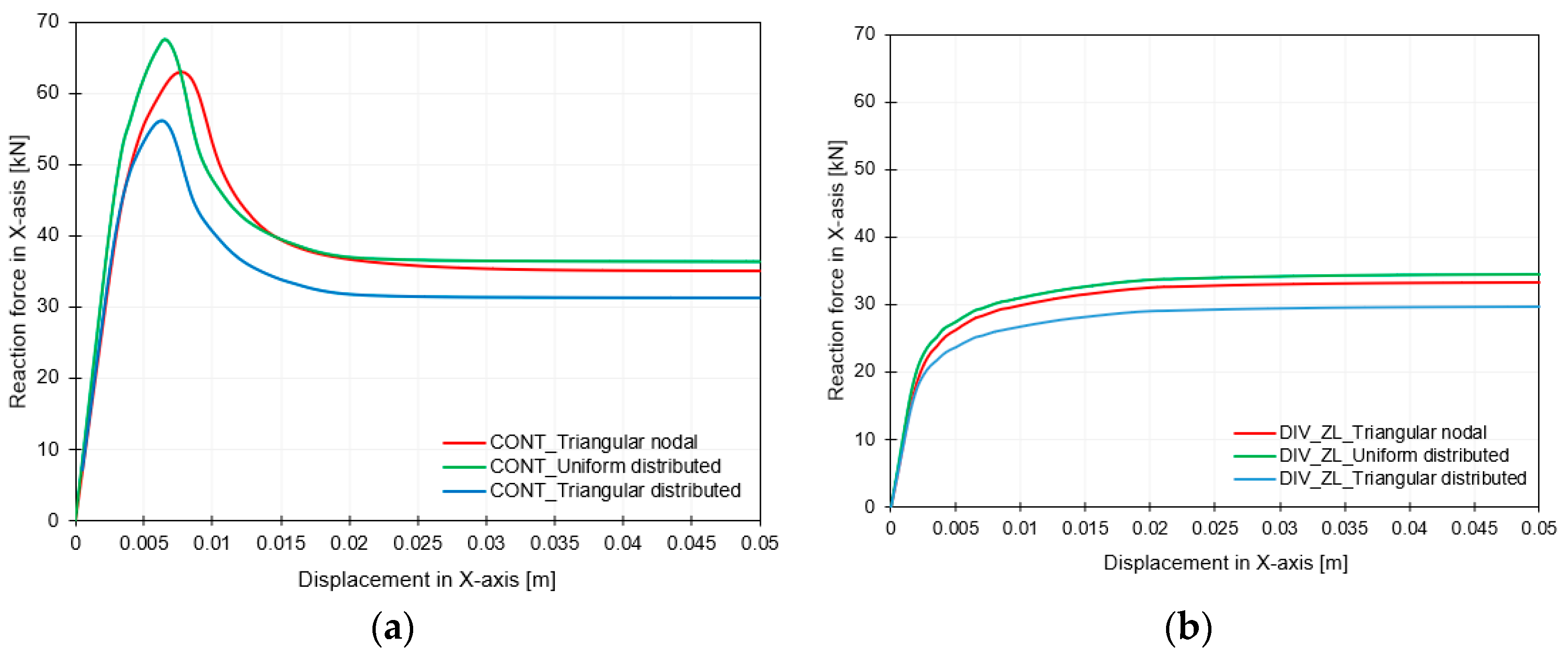 Figure 8b. In fact, in the discontinuous (DIV-ZL) configurations, governed by the Mohr–Coulomb interface criterion, the failure mechanism was dominated by sliding at the interfaces rather than by column overturning. The adopted values of friction coefficient and cohesion resulted in progressive shear slip under horizontal actions, delaying uplift and preventing overturning within the analysed displacement ranges. Instead, gradual energy dissipation through interface sliding has dominated the behaviour. This mechanism has reduced the peak resistance by about 50%, from 66 kN (continuous) to 36 kN (segmented).