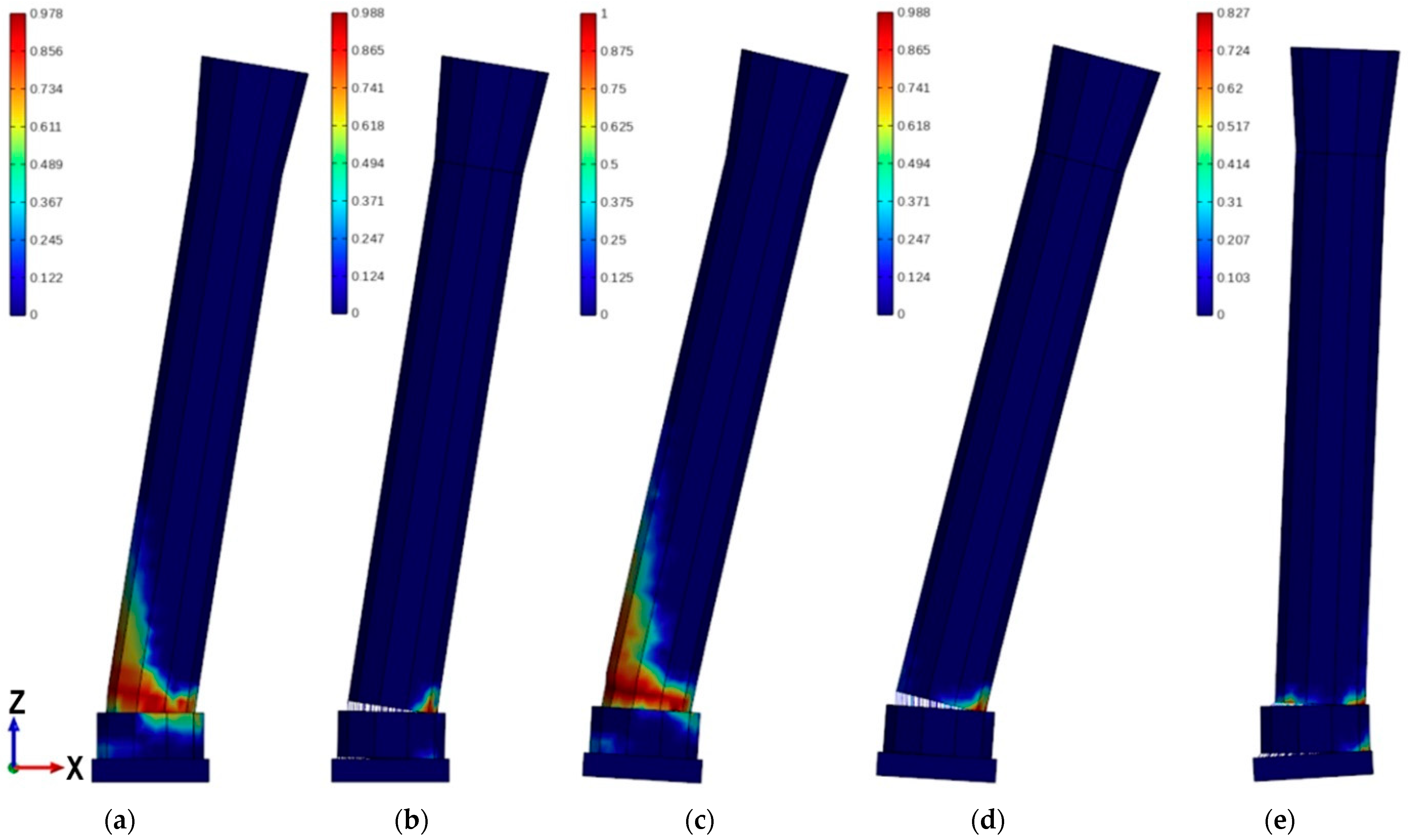 Figure 9d,e, the combination of contact interactions and geometric imperfections has proved especially detrimental. In the +3.5° case, lateral resistance has been minimal, with peak loads barely exceeding 1.8 kN. This suggests that rocking and sliding at the interfaces have completely dominated the response. Conversely, the −3.5° case has displayed a delayed but much stronger resistance. After an initial phase of sliding with negligible capacity, the column has mobilised a peak resistance of about 68 kN, significantly higher than in other inclined cases. Here, the tensile damage has stabilised at 0.83, while compressive damage peaked at 0.64. This confirms that energy dissipation through sliding became the governing mechanism.