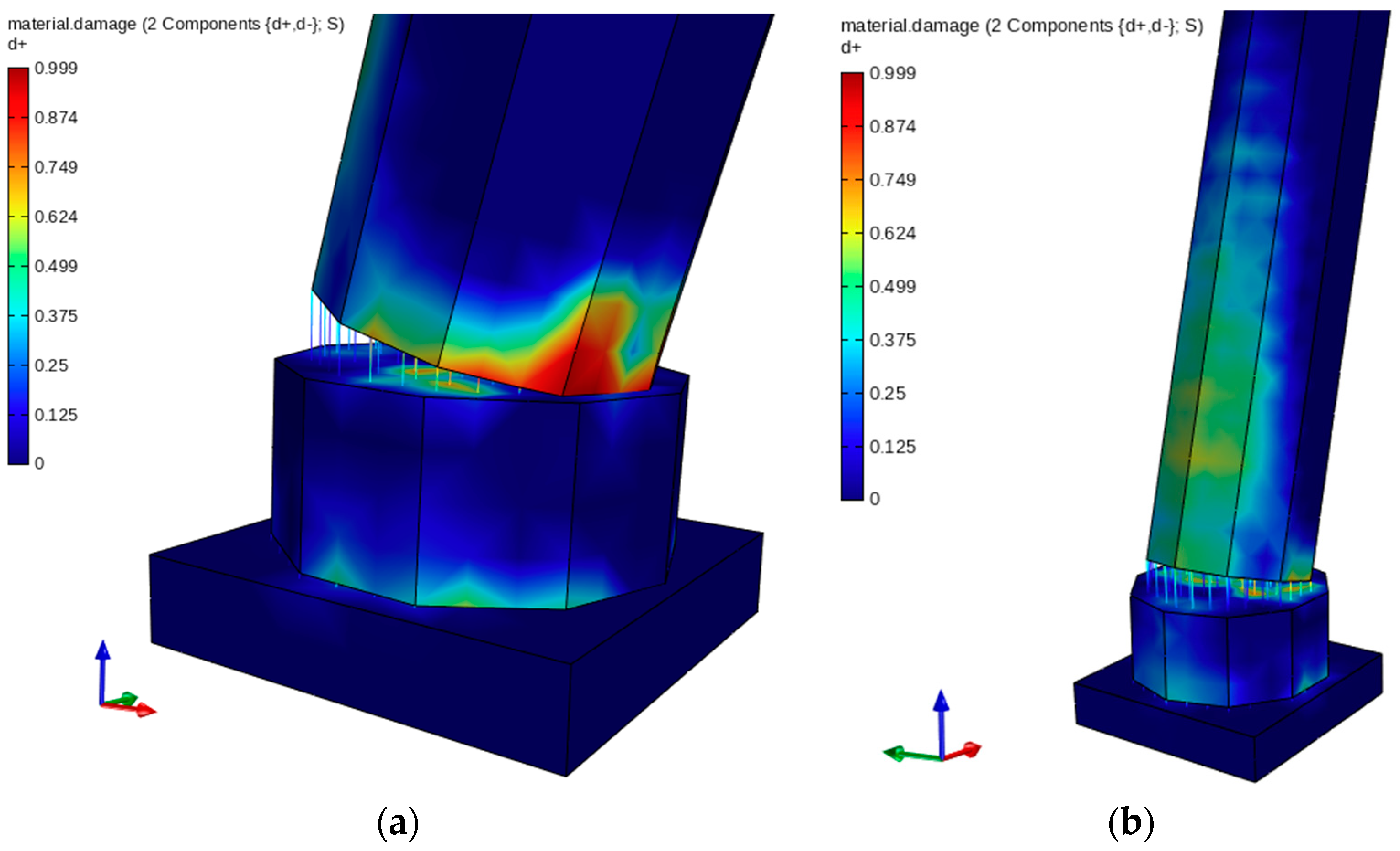 Figure 9a, tensile damage has reached d+ = 0.98. This indicates a high likelihood of cracking, while compressive damage has remained moderate (d− ≈ 0.6).