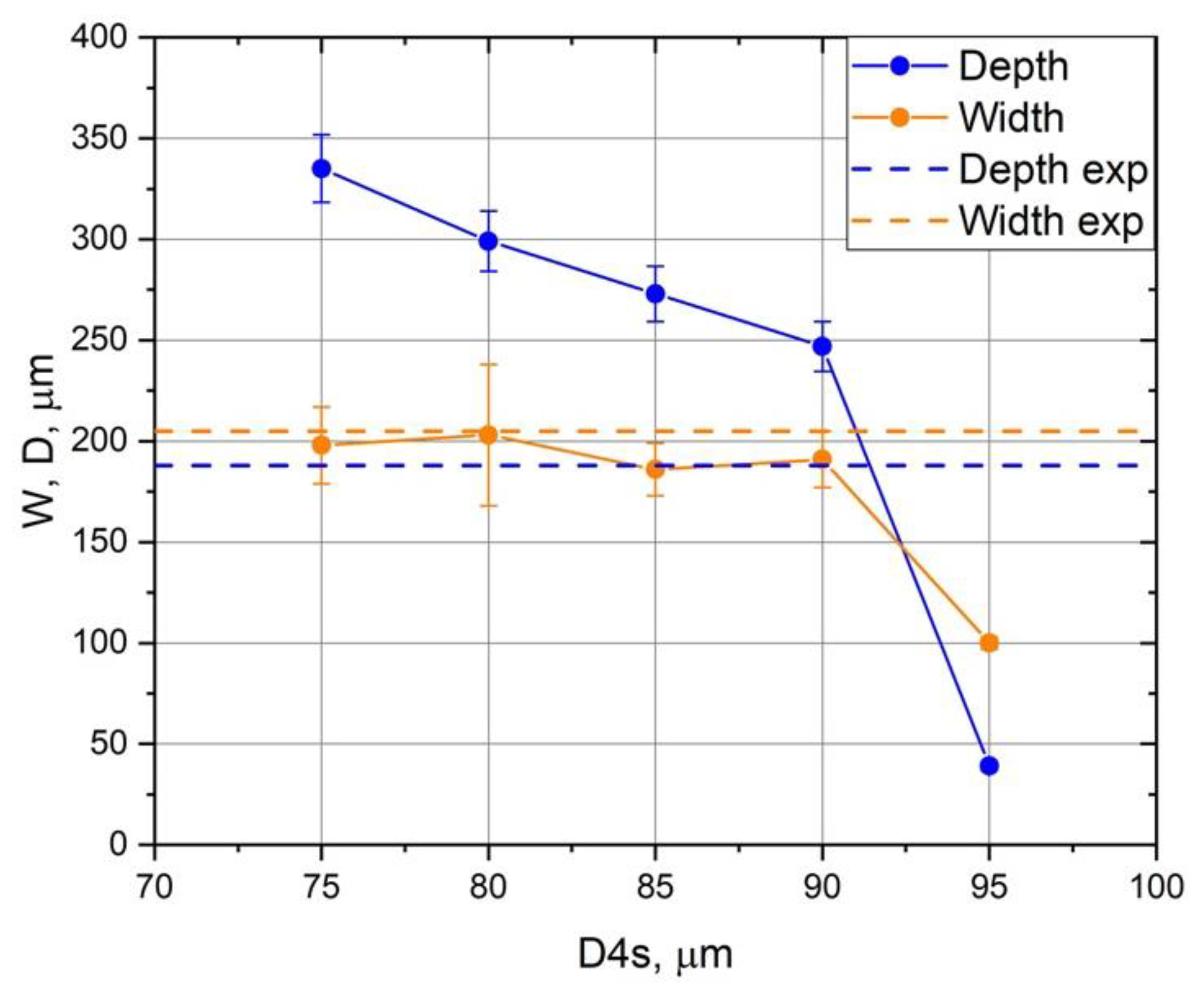 Figure 4) established that the nominal value of the width D4s = 80 µm is consistent with reality (defocusing is insignificant), and this value was used in further studies.
