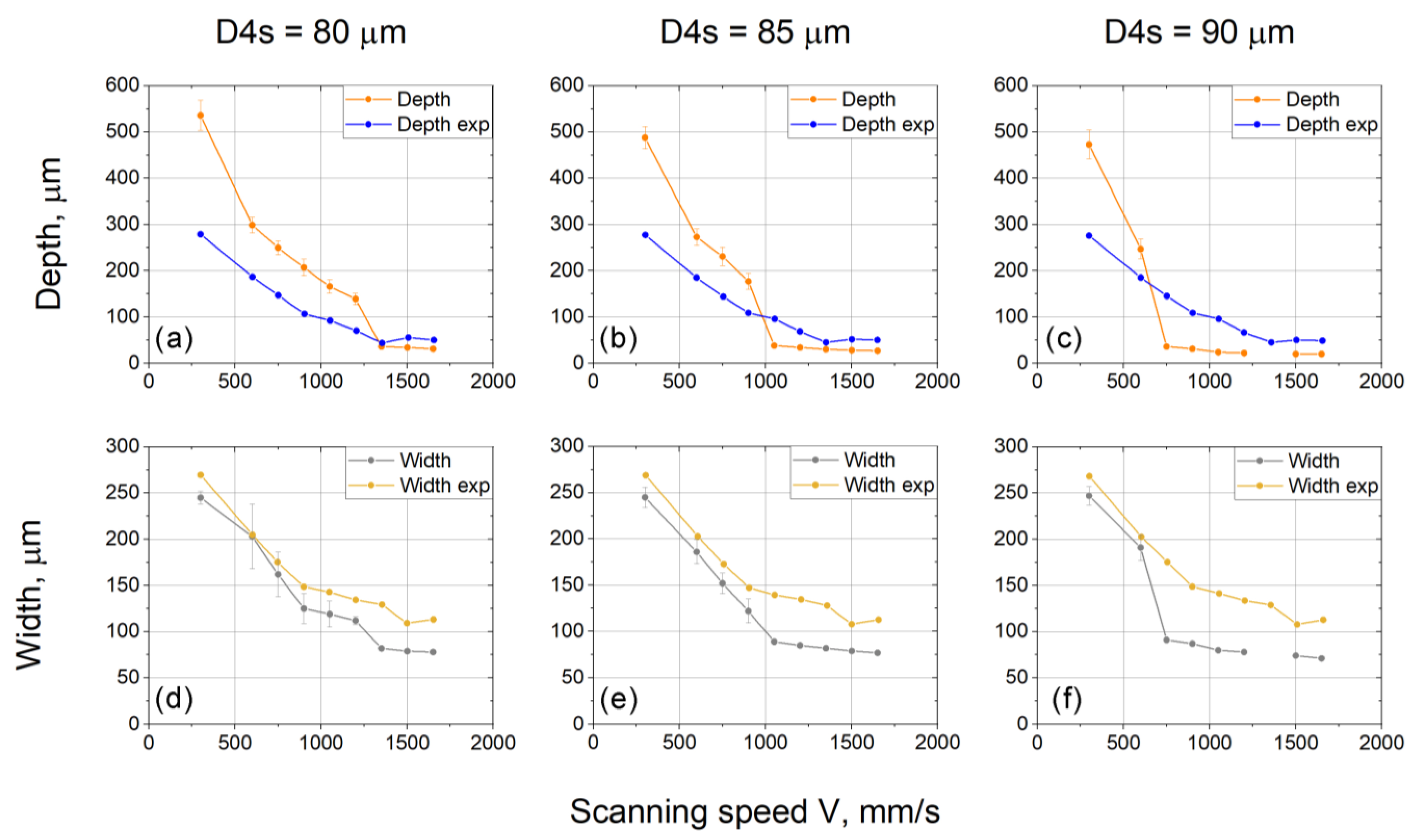 Since it is rather difficult to determine the true diameter of the laser beam experimentally, the dependence of the morphology of the tracks on the beam diameter (D4s) was investigated by simulation. The results of the simulation and comparison with the experiment are shown in