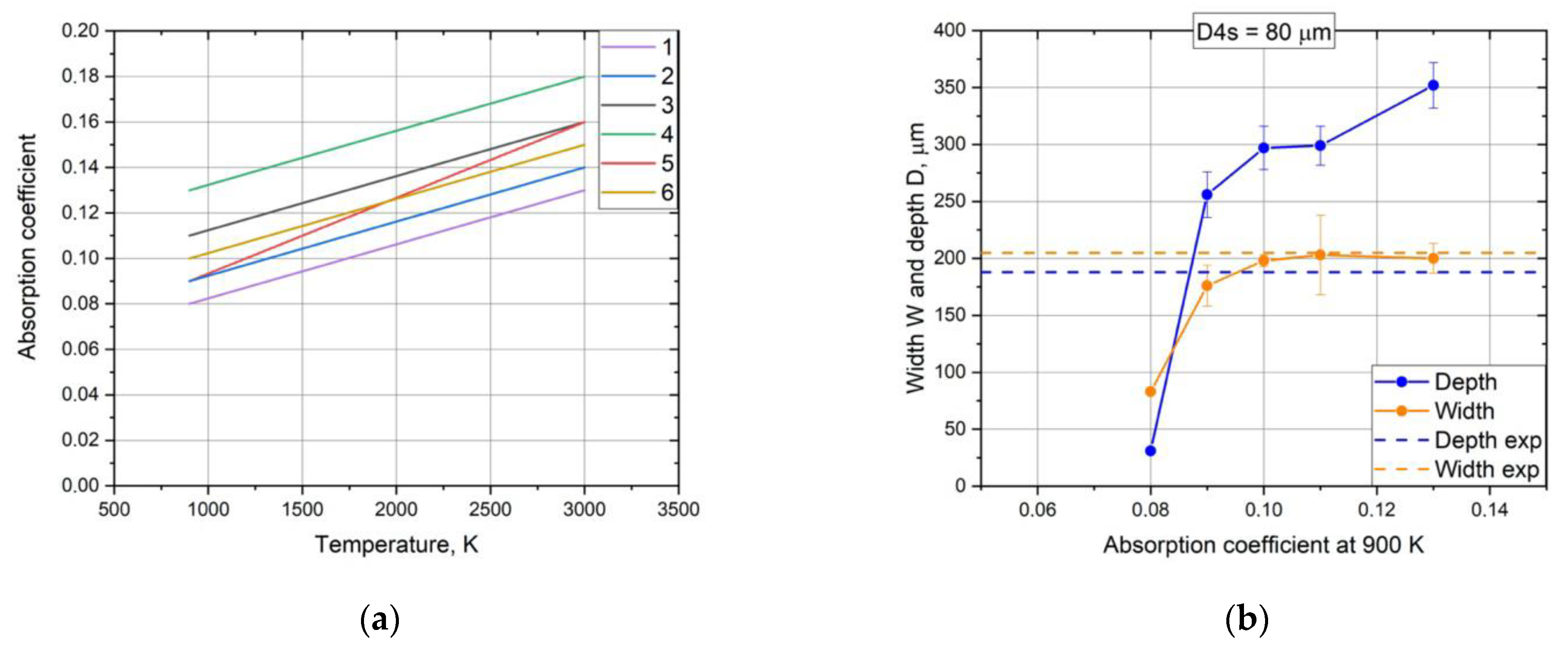 The absorption of the liquid phase (the melt) depends on the temperature. This parameter is rarely studied in the literature, and the specific absorption value may depend on the alloy composition. The effect of the absorption coefficient on the depth and width of the melted region was studied. The results are shown in