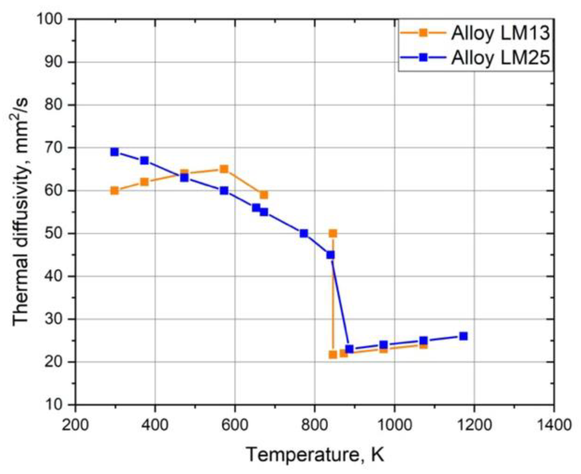 Reference values of thermal diffusivity for the solid and liquid phases for LM13 and LM25 alloys [