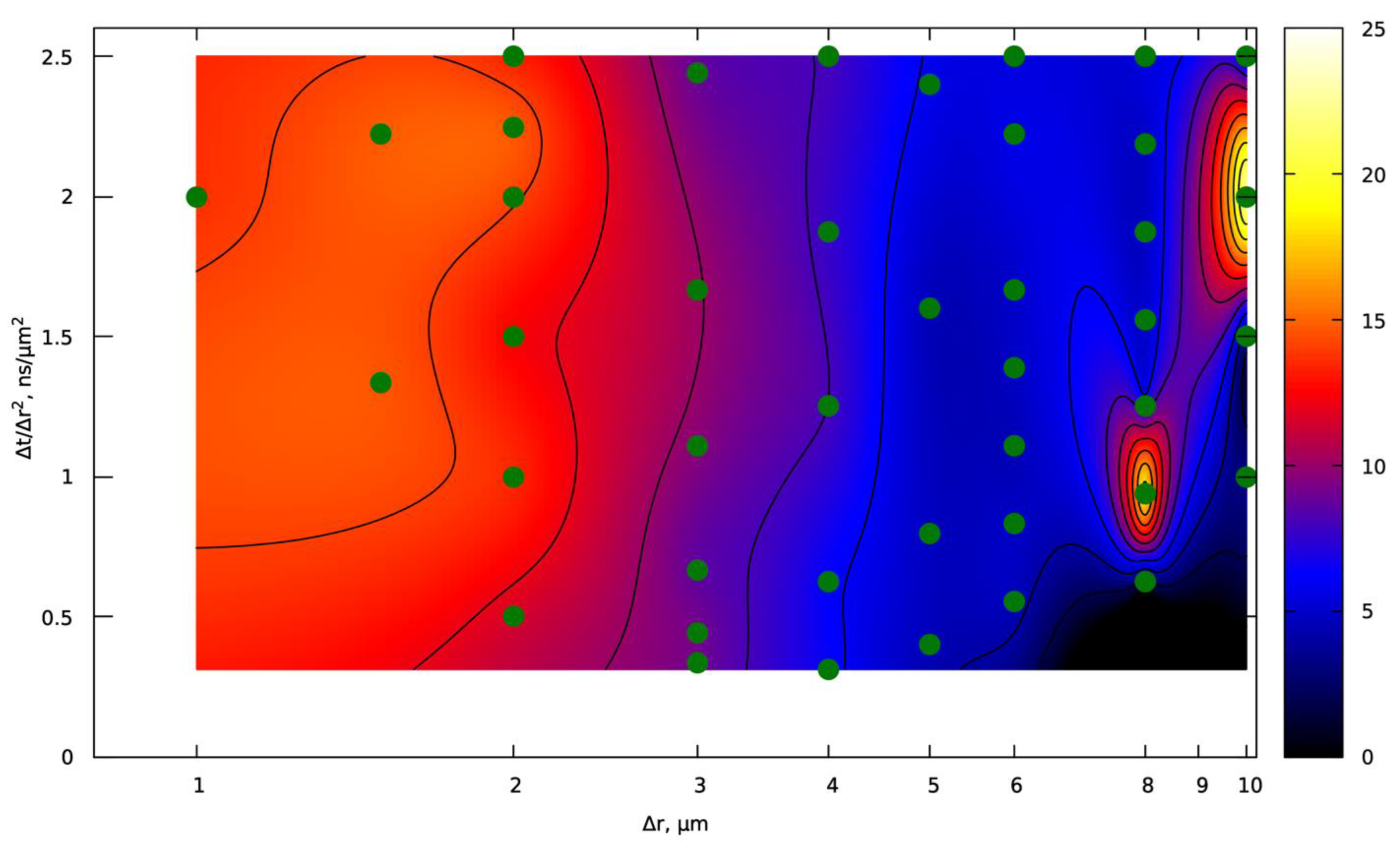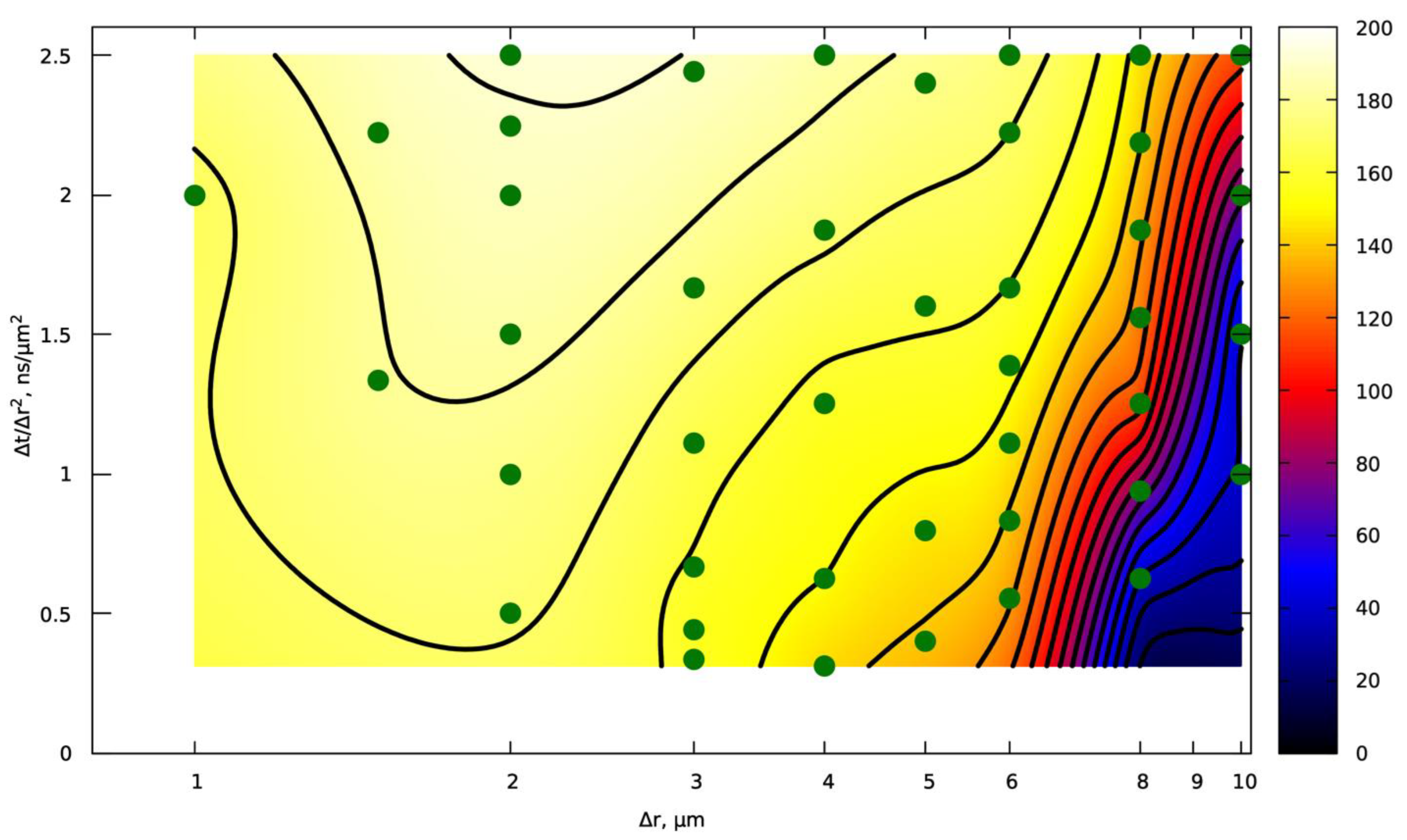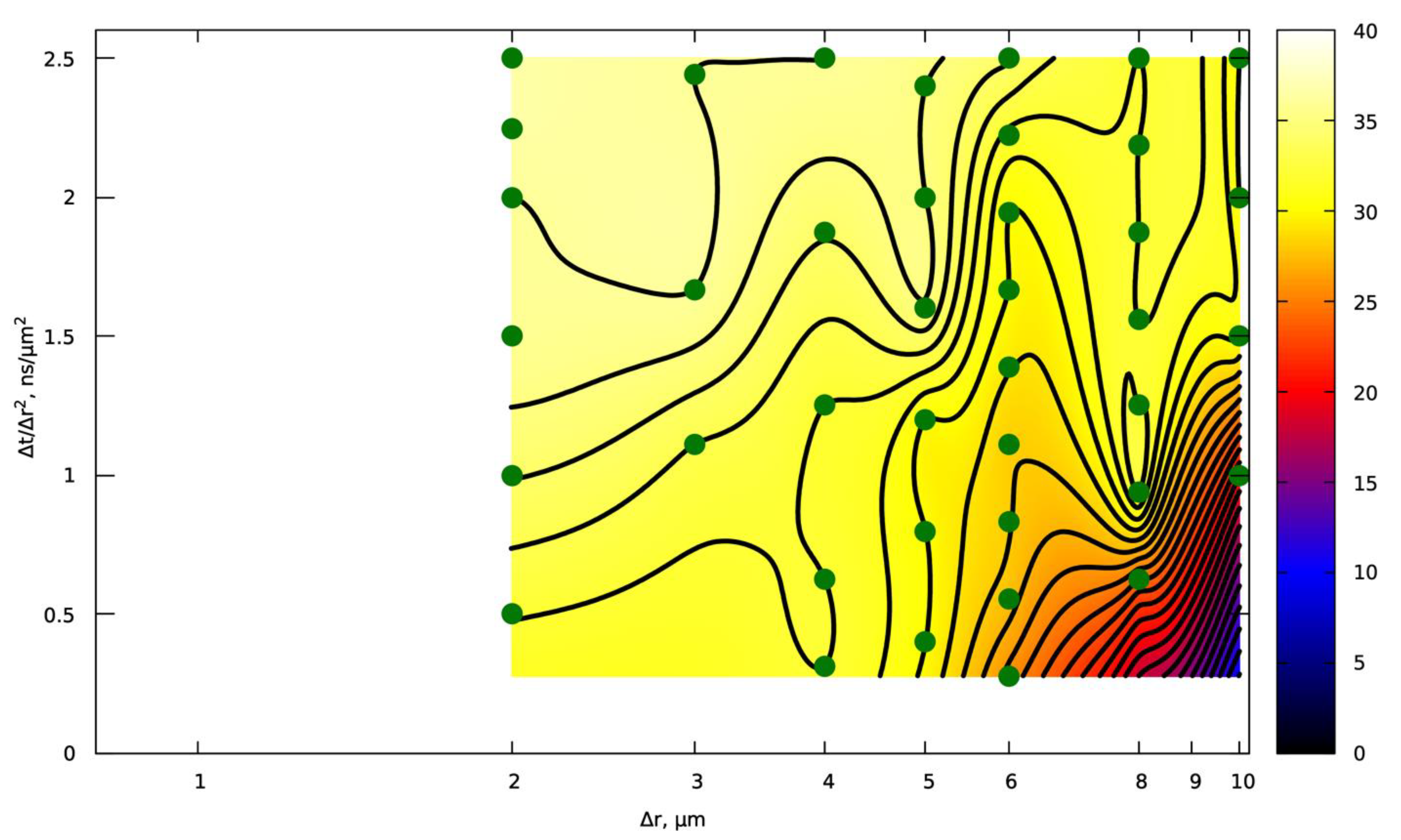 The results show that adequate solution accuracy and constructive convergence can be discussed only for spatial steps of ∆x ≤ 6 μm. If we assume that the most accurate solution is achieved for ∆x, ∆t → 0, then we can state that for the case of intense melting, with a decrease in the time step, the depth generally decreases, and with a decrease in the spatial step (while maintaining the ratio ∆t/∆x2 = const), the depth increases. Nevertheless, in general, the error in the track depth is no greater than the depth variation. It follows that the use of the values ∆x = 6 μm and ∆t = 90 ns is optimal in terms of ensuring high computational throughput while maintaining adequate solution accuracy. For non-intense melting, it is also clear that the values ∆x = 6 μm and ∆t = 90 ns also provide acceptable accuracy.