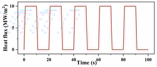 where u is the displacement vector. The temporal evolution of the heat flux applied to the top surface of the tungsten is shown in Figure 2. A total of five loading cycles were simulated to study the time-dependent behavior of temperature, stress, and strain. Each cycle consisted of 10 s of heating followed by 10 s of cooling. Perfect thermal contact was assumed at all material interfaces [,,,].