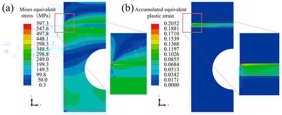 (a) Variation in von Mises equivalent stress over time. (b) Variation in cumulative equivalent plastic strain over time.