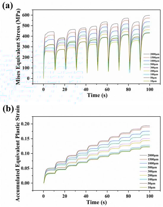 Figure 6a shows the evolution of the Mises equivalent stress in the tungsten layers of different thicknesses during thermal cycling. The stress–time curves clearly indicate that the rate of increase in the peak equivalent stress during the cooling phase is significantly higher than that during the heating phase, and this difference becomes more pronounced with increasing material thickness. During the heating process, although the thermal expansion of the copper layer is restricted by the tungsten layer to generate compressive stress, the decrease in the elastic modulus of the copper under high temperature and the combined action of the plastic flow effect effectively relieve the stress accumulation, making the stress increase relatively gentle.