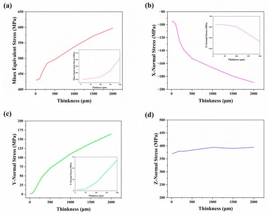 Figure 7 reveals the significant influence of the tungsten sheet thickness on the interfacial stress state. The data show a clear positive correlation between the axial thickness of the W-PFM and the Mises equivalent stress, i.e., as the thickness increases, the level of equivalent stress also rises. However, when the thickness decreases below 100 μm, this increasing trend slows noticeably. Further analysis indicates that this phenomenon stems from the synergistic reduction in normal stresses in both the X and Y directions: when the thickness falls below 100 μm, the normal stresses in both directions exhibit a plateauing decline, with the Y-direction normal stress approaching nearly zero once the thickness reaches 10 μm. In particular, these stress data are collected at the end of the cycle load (the process equivalent stress reaches the maximum value).
