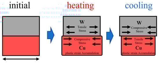 where and represent the free thermal deformations of the tungsten and the copper, respectively; and denote the coefficients of thermal expansion of the tungsten and the copper, respectively; and ΔT is the temperature change.