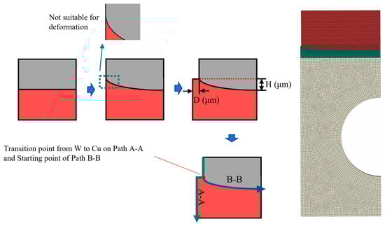 Given the significant pressure and plastic strain at the interface resulting from the thermal expansion mismatch between the tungsten and the copper, replacing the flat W/Cu interface with a curved geometry can alleviate stress concentration. However, this may lead to an overly narrow (sharp) geometry in the oxygen-free copper region, which is unfavorable for sufficient deformation. Therefore, the Cu and CuCrZr regions are extended outward in the X direction to provide adequate deformation space, as illustrated schematically in Figure 10. Throughout the design process, the vertical distance between the top surface of tungsten and the lowest point of the curved interface, as well as the distance from that point to the center of the cooling channel, remain unchanged. The shape of the interface is controlled by two parameters: the vertical rise height H of the highest point of the Cu region and the lateral extension distance D of the Cu/CuCrZr boundary in the X direction. The meshed model of the designed structure is also shown in Figure 10. Paths A-A and B-B are defined to better account for the effect of the structure on temperature and interface stresses.