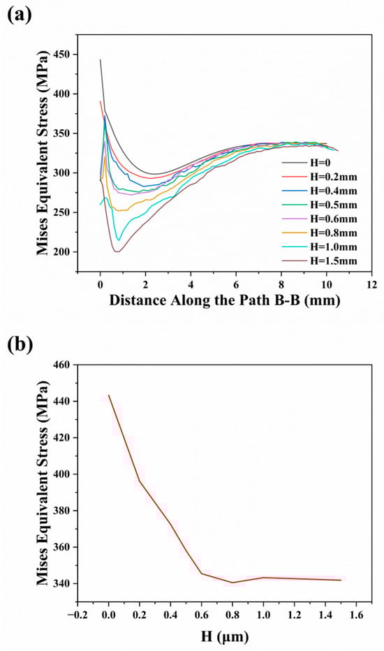 From the perspective of stress distribution, the introduction of the curved interface significantly alleviates the original stress concentration issue. As the value of H increases, the concentrated stress that originally appeared at the tungsten vertex away from the cooling channel in the W/Cu interface is effectively relieved. By analyzing the distribution of the stress path along B-B (Figure 12a), it is clearly observed that at the initial stage of the increase in the value of H, the left-side stress peak point gradually shifts towards the central region. When H exceeds 600 μm, the left position is no longer the maximum point of interface stress, which fully demonstrates that the arc interface has excellent stress release capacity. Further analysis shows that the maximum stress at the interface decreases continuously with the increase in H (Figure 12b), and when H exceeds 600 μm, the position of the maximum stress shifts to the area above the pipe center. The stress here is mainly from the extrusion of the surrounding tungsten on the central area, and the arc interface becomes relatively straight at this place, so the impact of the arc interface on the stress in this area is relatively limited, and the reduction trend tends to be stable.