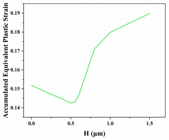 A nonlinear variation in plastic strain behavior has been observed, as illustrated in Figure 13. As the value of H increases, the accumulated plastic strain exhibits an initial decrease followed by a sharp increase. The initial decline indicates that an appropriately designed interface geometry can effectively mitigate stress concentration and reduce plastic deformation. However, the subsequent rapid increase can be attributed to two main factors. The first is the continued rise in H, which leads to elevated temperature in the copper region, resulting in accelerated material softening and promoting further plastic strain. The second is the significant alteration in the geometry of the copper zone, which reduces the space available for deformation.
