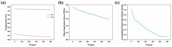 The impact of D on finite element results. (a) The maximum temperature of W and Cu, (b) Maximum stress of W. (c) The maximum cumulative equivalent plastic strain of Cu.