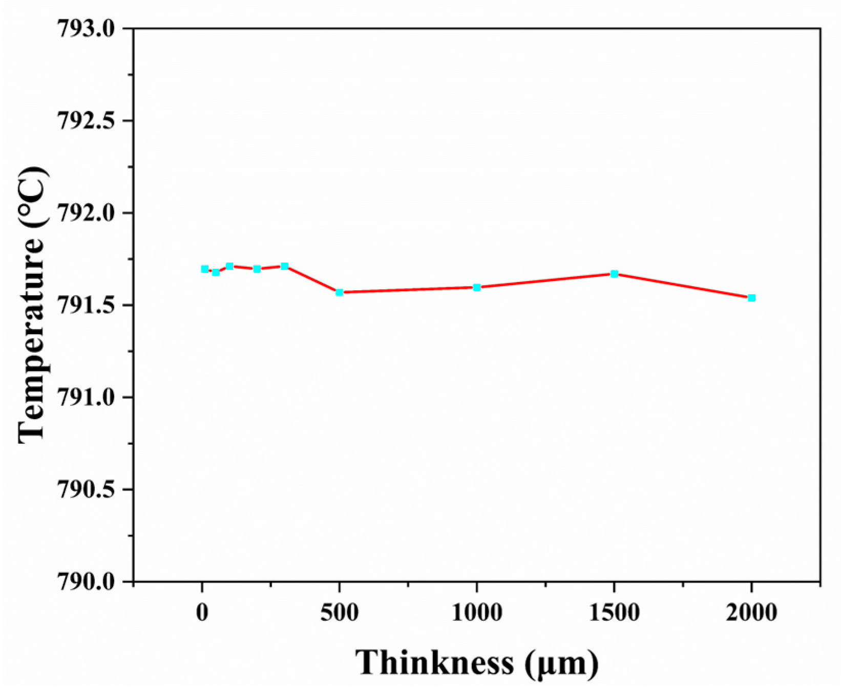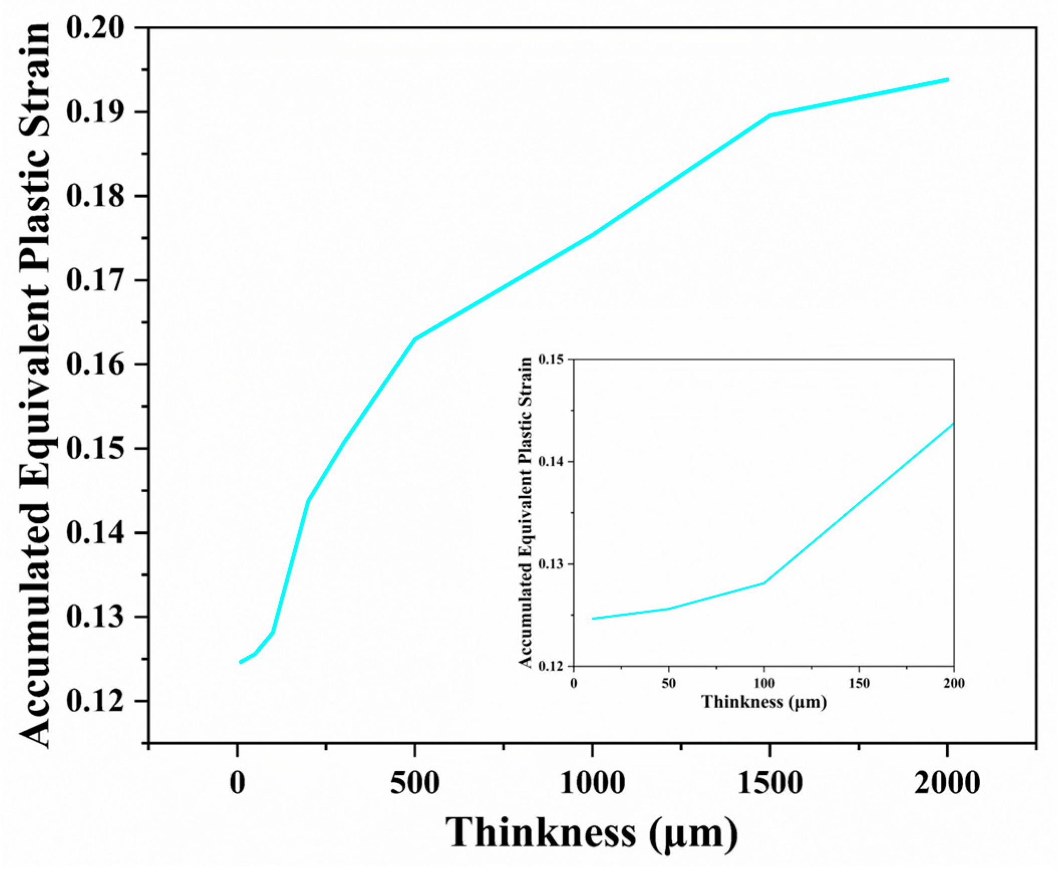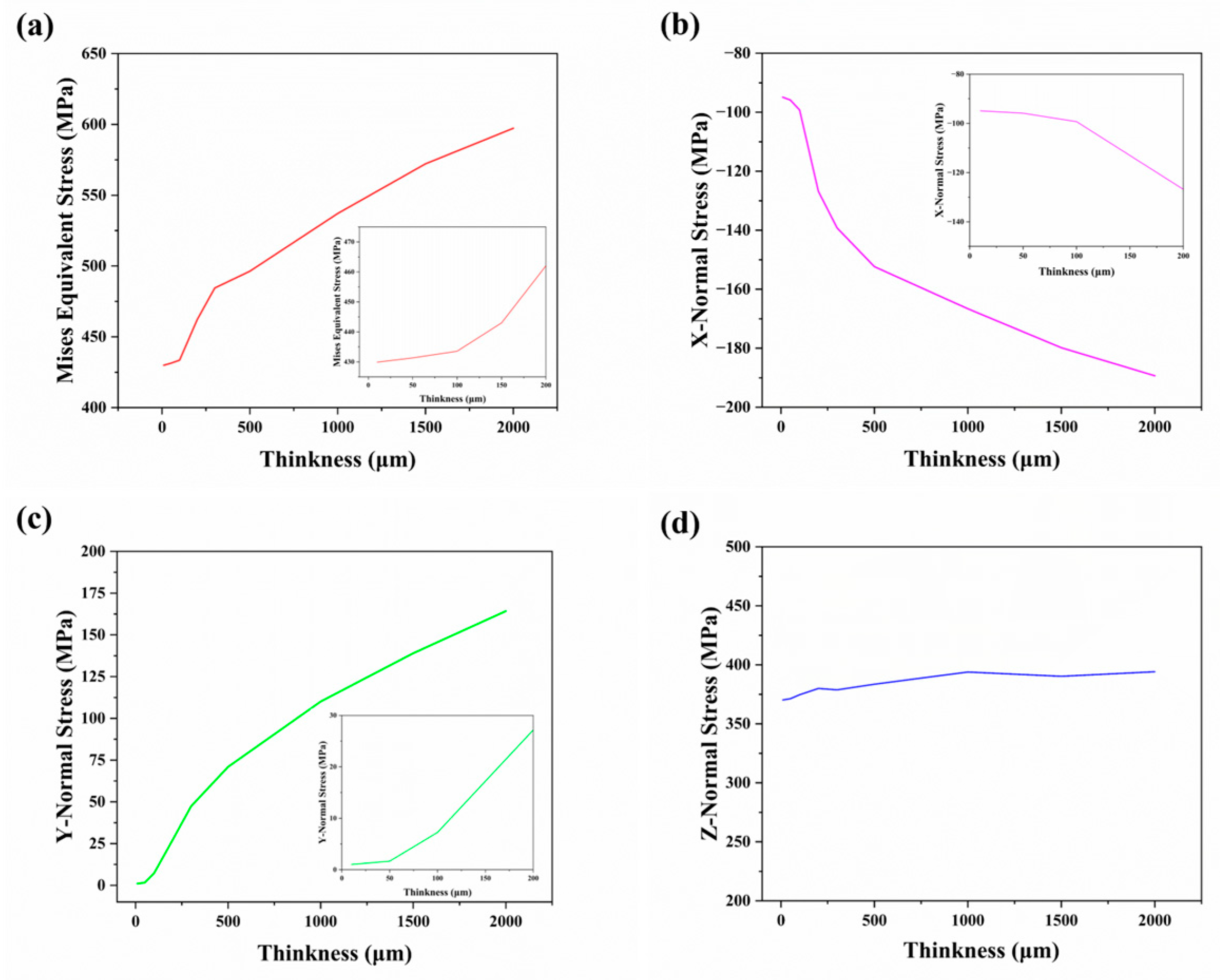 - Laminated tungsten PFM: It was found that as the axial thickness of the tungsten sheets decreases from the millimeter scale to the micrometer level, the thermal mismatch deformation δ in the Y direction between the tungsten and the copper exhibits a significant decreasing trend. This geometric size effect directly leads to a systematic reduction in the normal stress in the Y direction at the interface. When the thickness is reduced to 10 μm, the normal stress in the Y direction approaches nearly zero. This phenomenon fundamentally confirms the notably improved thermal deformation compatibility of the materials at the micrometer scale, offering a new approach for regulating interfacial stress.