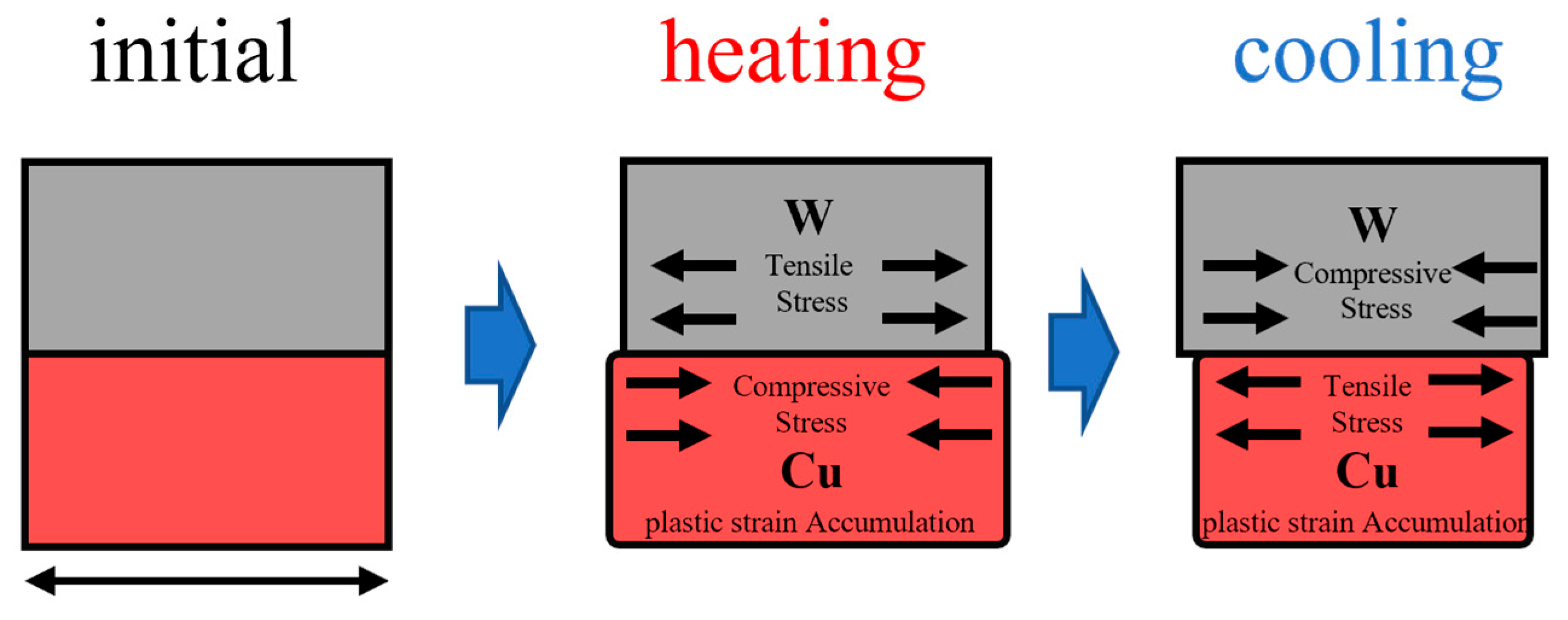 - Qi, C.; Qi, Y.; Song, H.; Wang, X.; Xiao, S.; Wang, B. Finite Element Analysis and Experimental Verification of Thermal Fatigue of W-PFM with Stacked Structure. Metals 2024, 14, 555. [Google Scholar] [CrossRef]