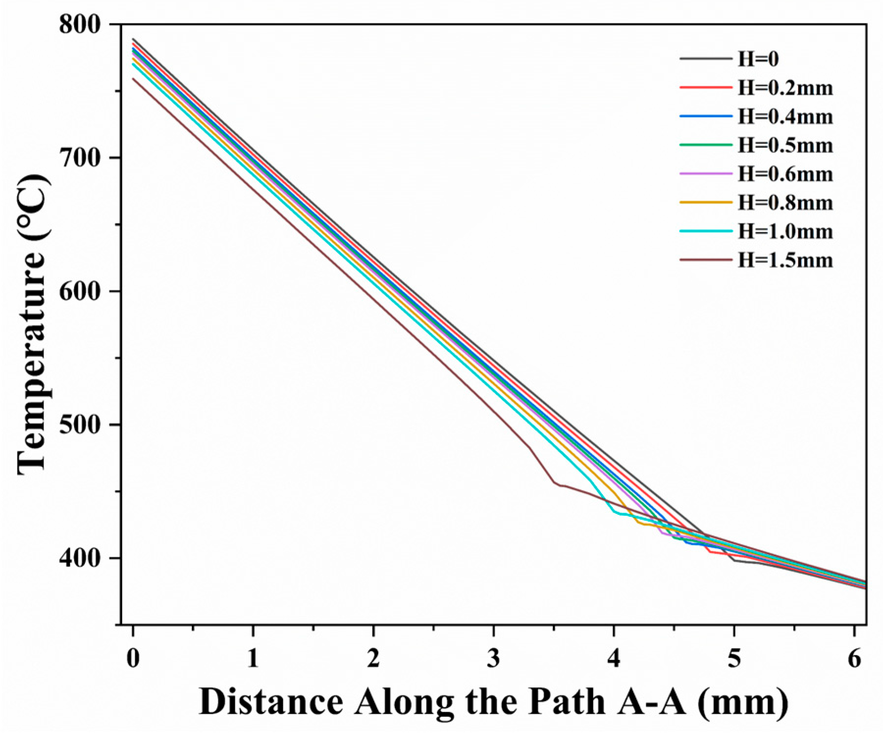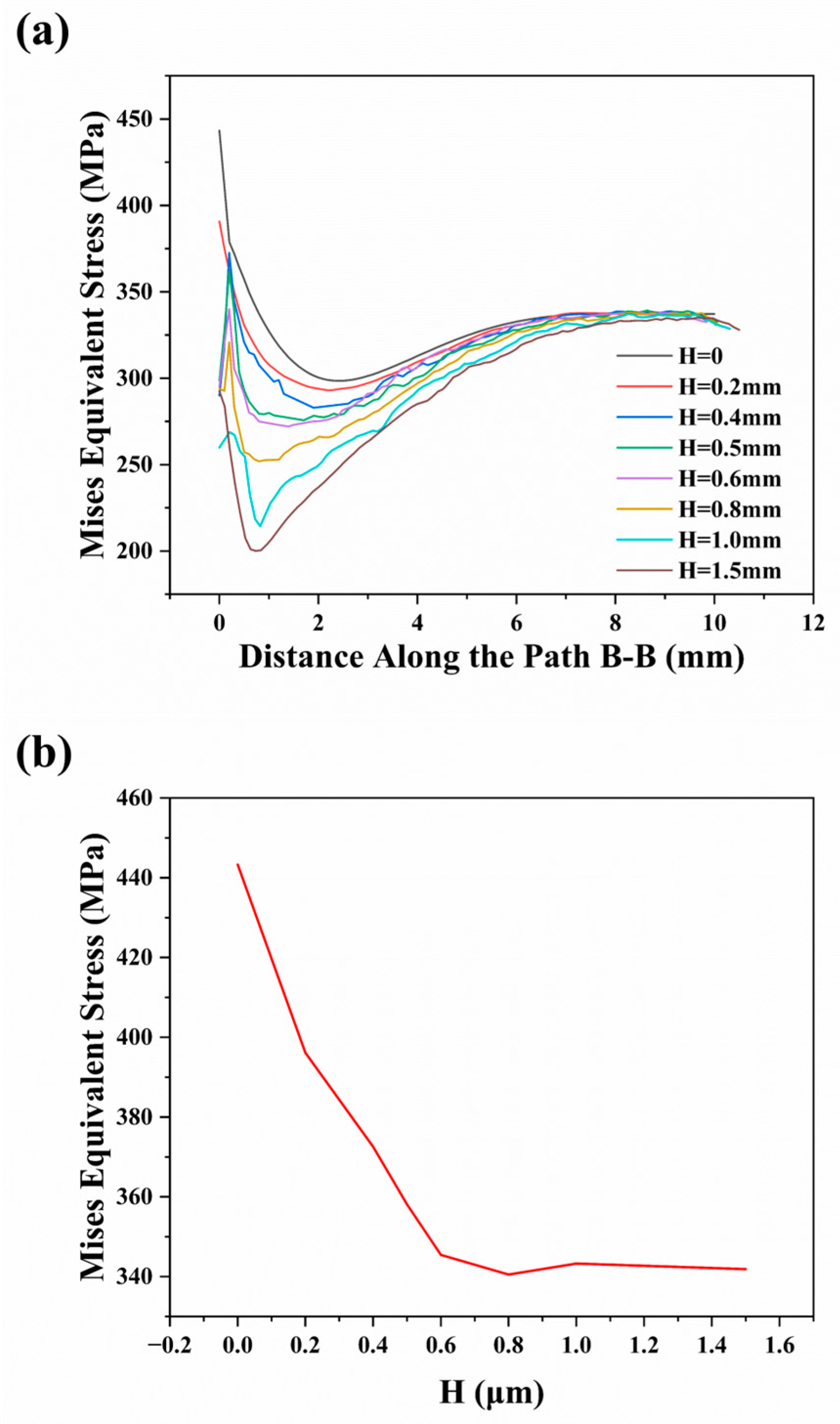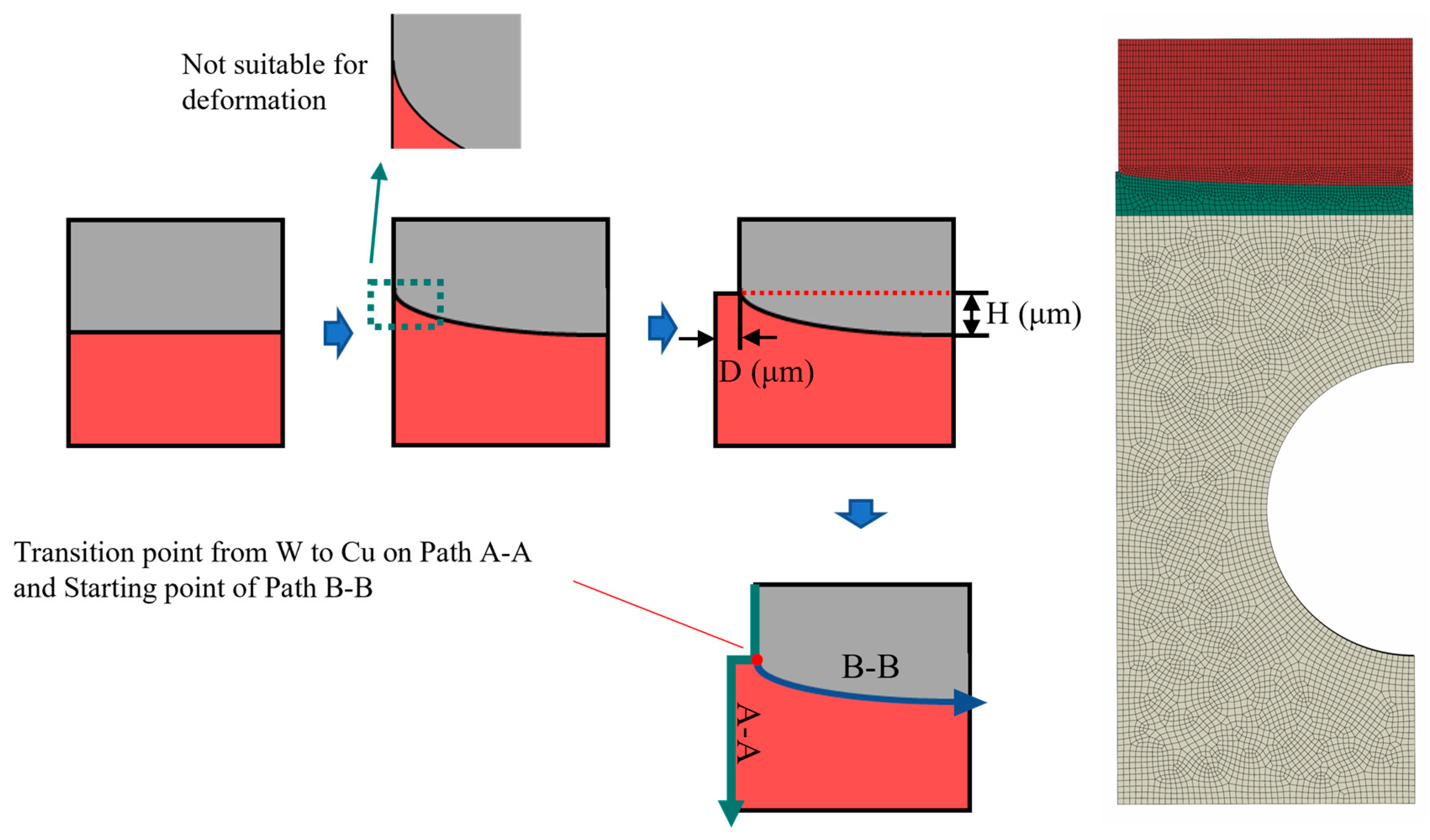 - In the study on interface geometry optimization, the conventional flat interface was modified into a curved structure. Experimental data indicate that as the distance H of the highest point of the Cu region increases, the stress concentration zone undergoes significant spatial redistribution, shifting gradually from the initial tungsten vertex location toward the central area. Quantitative analysis shows that when the value of H exceeds 600 μm, stress concentration no longer occurs at the original vertex position. This improvement effectively mitigates the risk of interfacial fatigue failure, thereby enhancing the service life of the PFC joint.