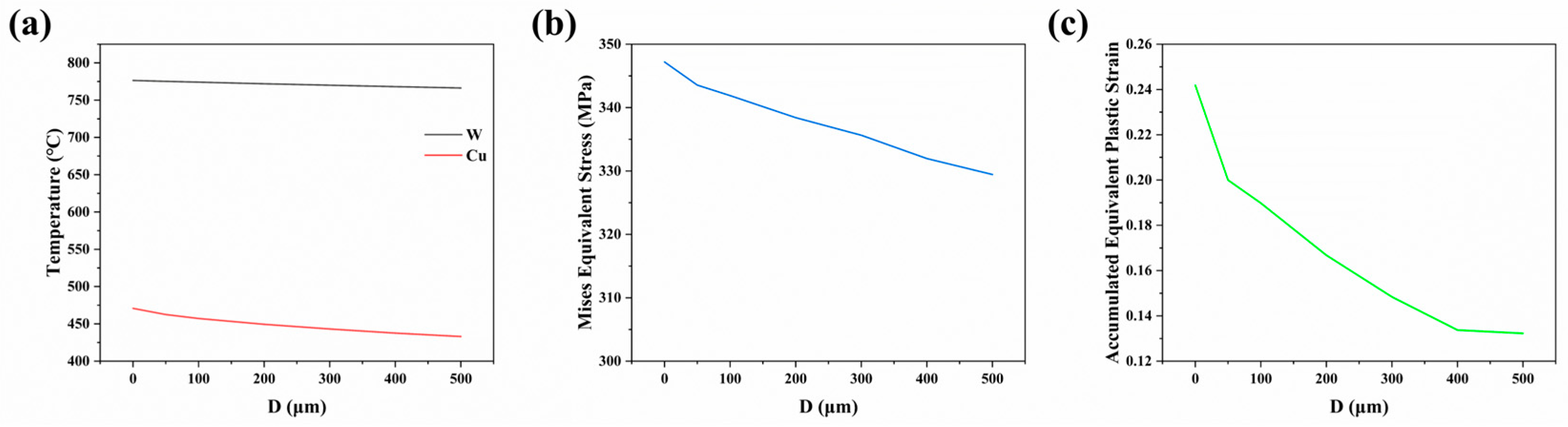 - The study further revealed that interface optimization must be coordinated with the overall structural design. As H gradually increases, the deformation space within the Cu/CuCrZr region becomes progressively constrained. By increasing the value of D, sufficient space for deformation accommodation can be provided, thereby reducing plastic strain in copper. This geometric compatibility relationship fundamentally reflects a dynamic balance between the material’s deformation capacity and external constraints. Its optimization design requires comprehensive consideration to achieve the optimal balance between stress relief effectiveness and structural reliability.
