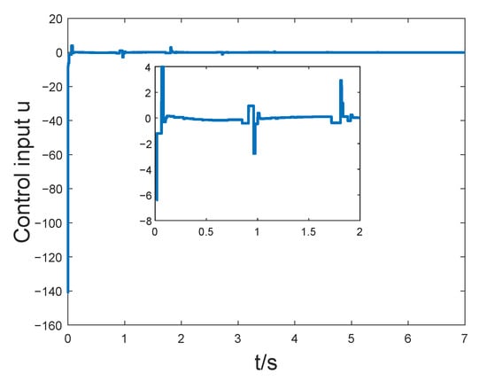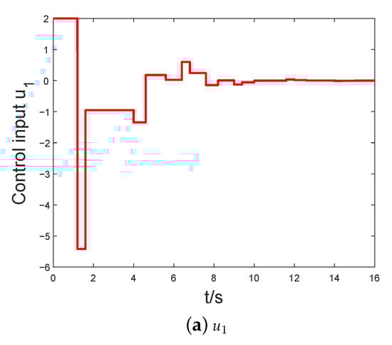 To implement the ETSFC, we selected with initial conditions =. Considering the piecewise linear nature of Chua’s diode characteristic f, the controller was systematically developed for three distinct operational regions. For the case where , Theorem 3 yields the control law u=−30.2781−20.1238−10.5643+50.2735 with the positive definite matrix