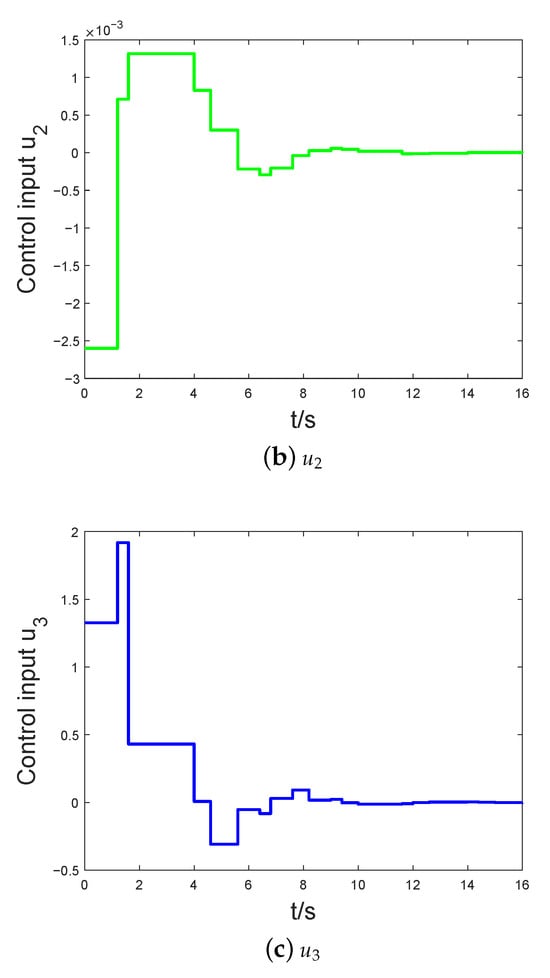 Figure 1 displays the closed-loop system’s state trajectories, while Figure 2 presents the triggeringinstants and Figure 3 illustrates control input u. In this simulation, the controller triggered a total of 18 events, with an average inter-event time of 0.889 s and a minimum inter-event time of 0.2 s. The system reached steady state within 10.814 s (tolerance = 0.01), confirming that the proposed method achieves asymptotic stability with a remarkably low communication rate. For comparison, a conventional periodic control scheme with a fixed sampling period of h = 0.2 s would require continuous updates, whereas the proposed PETOFC achieves a comparable response with over an order-of-magnitude reduction in communication.