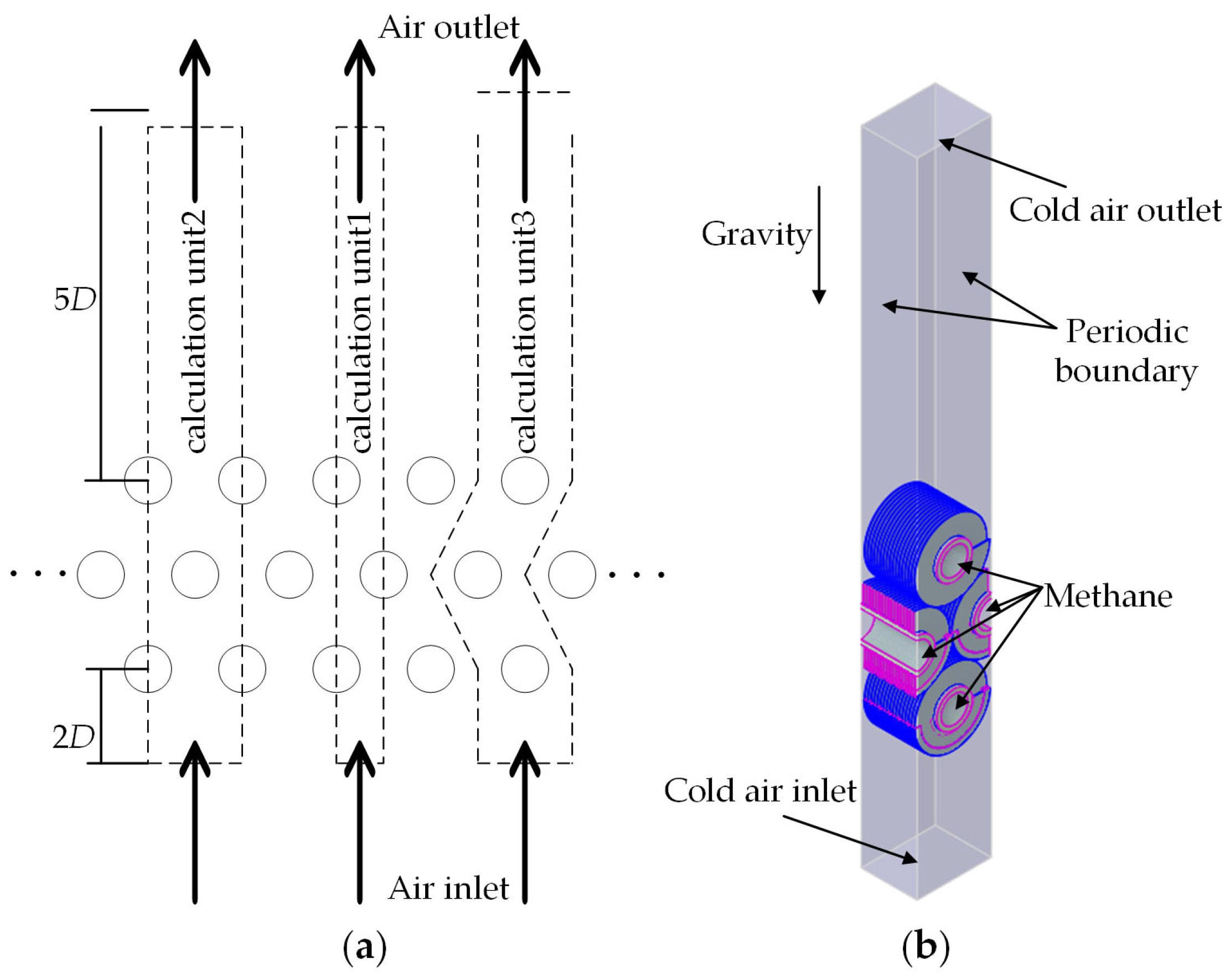 In this study, the heat exchanger is configured as follows: to reproduce the continuous arrangement of finned tubes in practical applications, the side surfaces of the computational domain were set as periodic boundary conditions. In this way, the model only needs to simulate a single representative unit to accurately infer the overall thermal–flow behavior under similar operating conditions. Methane was selected as the working fluid inside the tube. The inlet boundary was set as a mass flow inlet with a total mass flow rate of 0.21 kg/s. Considering the existence of periodic boundaries, there are two inlets corresponding to half of the total inlet area, so their mass flow rate was set to 0.105 kg/s. The inlet temperature of methane was 85 °C, and the outlet boundary was set as a pressure outlet with a gauge pressure of 0 Pa to simulate the pressure relief condition during actual operation. For the external air domain, air was used as the cooling medium. The inlet was set as a velocity inlet, and the outlet was set as a pressure outlet. All walls were defined as no-slip stationary walls to ensure that the interaction between airflow and solid surfaces conforms to the real convective heat transfer process.