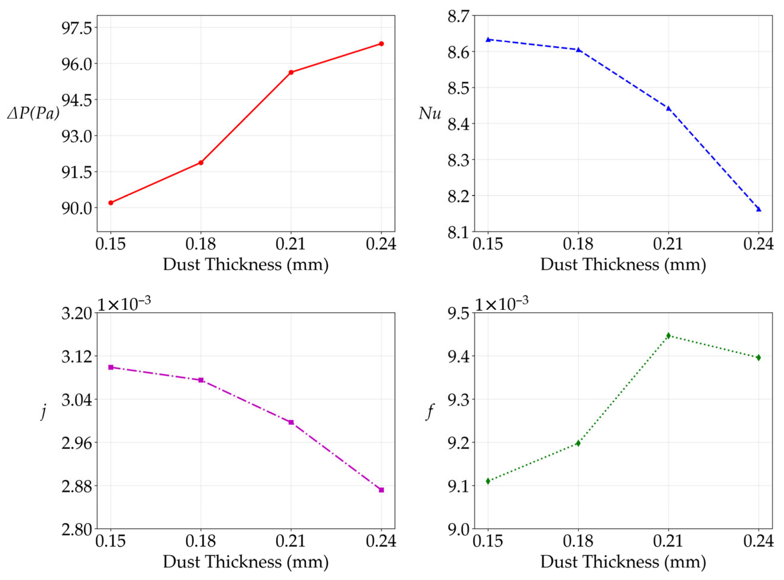 As the dust thickness increased, the pressure drop ΔP across the heat exchanger gradually rises, indicating that dust accumulation reduces the flow passage area and increases surface roughness, thereby enhancing flow resistance. In contrast, the Nusselt number and heat transfer factor decrease significantly with increasing dust thickness, suggesting that the dust layer introduce additional thermal resistance on the heat transfer surface and alter the flow boundary layer structure around the fins, consequently impairing convective heat transfer capacity.