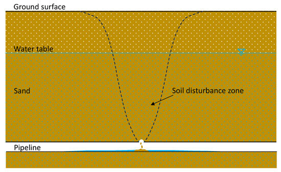 Flow-induced failure in geomaterials, exemplified by ground collapse due to underground pipeline leakage, is a complex multi-physics process rooted in dynamic interactions between solid particles and pore fluid. As depicted in Figure 1, pipeline leakage triggers fluid interaction with surrounding sand: the infiltrating fluid reduces soil strength through elevated water content and pore water pressure, while simultaneously transporting particles to form a soil disturbance zone. This fluid–solid coupling ultimately leads to subsurface cavitation and potential ground collapse, accompanied by a depression in the water table above the leakage site. Traditional single-phase numerical methods, such as continuum-based finite element methods (FEM), fall short in capturing discrete particle-scale behaviors—including particle migration and contact breakage—that govern the initiation and progression of such failures. To address this, this study develops a fluid–soil interaction model to simulate ground collapse induced by underground pipeline leakage in water-rich sand layers.