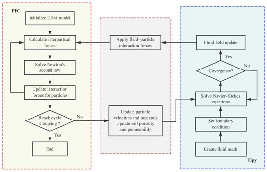 Figure 2 illustrates the CFD–DEM coupling procedure. First, solid particle models are established using the DEM module, while fluid meshes and parameters are configured via the CFD module. Subsequently, the stratigraphic model is discretized by Gmsh into computational grids with predefined boundary conditions for solving hydrodynamic equations. The interaction module then retrieves fluid cell data to solve motion equations, calculating cell porosity and average volume forces. These parameters are transferred to the CFD module to solve the Navier–Stokes equations. Finally, the computed flow field from CFD is imported into the DEM model, where fluid–particle interaction forces act as coupling linkages to achieve bidirectional fluid–solid coupling, thus completing the simulation of seepage-induced erosion processes.