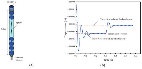 Another benchmark case is the upward seepage flow through a single column of particles. Suzuki et al. [] proposed a methodology for calculating seepage forces on particles during diffusion processes using an upward seepage flow model. As illustrated in Figure 4a, the present study employs a vertical column model comprising 100 densely packed spherical particles (radius = 0.5 mm) confined within a 1 mm-wide longitudinal space. Notably, the model scale is consistent with that in the literature [] to ensure direct comparability between the simulation results of this study and the theoretical data in the reference. Initial settlement displacement is determined under non-seepage conditions, followed by upward seepage flow application at the base with velocity 0.005 m/s. Displacement of the topmost particle is recorded throughout the process and compared against theoretical predictions. The initial settlement calculation formula adopted in this work is expressed as follows: