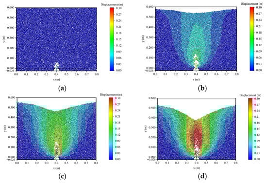 The results of the accident investigation show that ground collapse frequently coincides with rainstorms []. Consequently, a concurrent simulation of water level rise was implemented in this study. Using Python scripting in PFC, the entire 2D domain was designated as an inflow boundary to simulate water level elevation at a rate of 0.01 m/s.