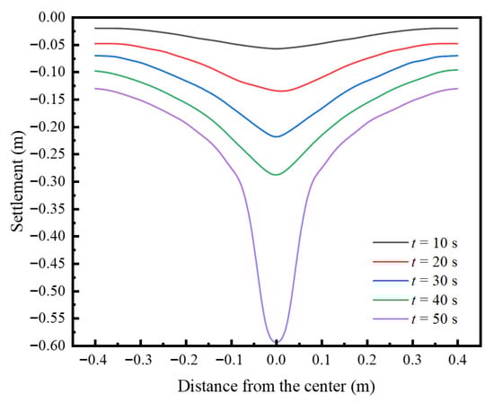 Groundwater infiltration caused by underground pipeline damage leads to the loss of soil particles, which is prone to surface settlement. Figure 8 depicts the characteristic temporal evolution of ground surface settlement simulated by the CFD–DEM coupling model. The curves at each moment are funnel-shaped, with the maximum settlement directly above the defect and a gradual decrease toward both sides, indicating that the seepage effect is most obvious above the defect. As time progresses, the soil deformation continues to accumulate and the disturbed area gradually expands, which reflects the dynamic settlement process of the soil under the action of continuous seepage.