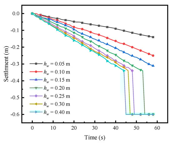 Figure 9 illustrates the settlement process at the ground surface directly above the defect under different groundwater levels. In the initial stage, the settlement rate is relatively slow. Despite the presence of cavities in the soil adjacent to the defect, the soil overlying these cavities still retains a certain degree of strength, thus slowing the development of surface settlement. As the soil disturbance zone expands continuously, the settlement rate gradually accelerates. Once the disturbance zone reaches the ground surface, the settlement rate surges rapidly, exhibiting a phenomenon of instantaneous collapse. Under identical conditions, a higher groundwater level leads to a more pronounced seepage effect and a more rapid ground settlement.