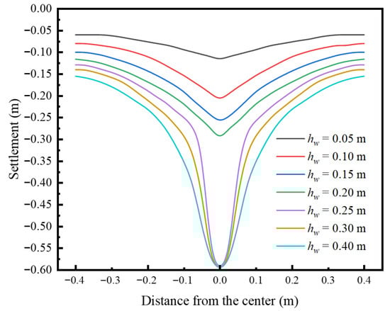 According to Terzaghi’s effective stress principle [], rising water level increases pore water pressure, which reduces effective stress and thereby diminishes soil shear strength. Meanwhile, as the groundwater level rises, the seepage effect at the pipeline defect becomes more pronounced, thus increasing the rate of soil loss. In this section, the authors defined the height difference between the groundwater level and the location of the pipeline defect as hw. As illustrated in Figure 18, when the hw rises from 0 to 0.2 m, the soil arch height increases from 0.10 m to 0.21 m. However, further elevation of hw leads to the stabilization of arch height with no significant growth. This indicates a threshold effect of the water level on soil arching: below this threshold, fluctuations exert a pronounced impact on the bearing capacity of the arch, whereas beyond it, further increases in the water level have a diminishing influence on effective stresses.