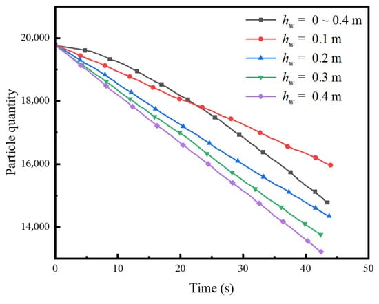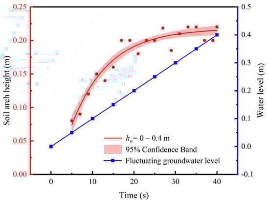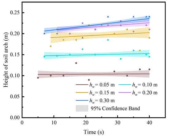 Figure 19 reveals a marked non-monotonic variation in the time required for stable soil arch formation with increasing water levels. Under low water levels, the height of the soil arch increases as the water level rises. Therefore, the time required to form the soil arch becomes longer. When the water level exceeds 0.2 m, the minimum soil arch height ceases to increase significantly. Elevated water levels intensify hydrodynamic pressure, accelerating particle loss, resulting in a shorter time required for the soil arch formation. Under high-water-level conditions (hw ≥ 0.4 m), the soil loss rate tends to stabilize, and thus the time required for soil arch formation also stabilizes. Ibrahim and Meguid [] similarly observed that beyond a critical limit, elevated groundwater levels do not significantly affect erosion rates.