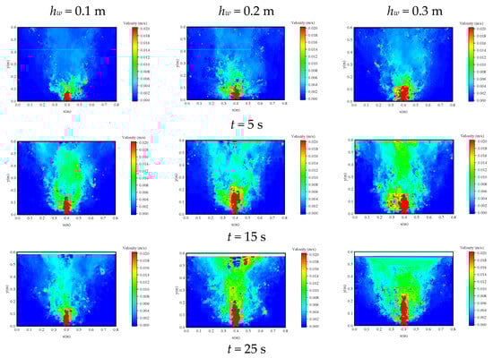 In the presented CFD–DEM model, the movement velocity of each particle can be tracked. Comparative simulations under varying initial groundwater levels reveal that elevated water levels enhance seepage forces, thereby increasing the migration velocity of soil particles. Figure 12 quantitatively compares the particle velocity distributions and evolution under different water levels. At the initial stage (t ≤ 5 s), seepage-disturbed zones expand markedly as the water level rises. Over time, the amplified seepage forces gradually mobilize a larger volume of soil into high-velocity migration states. Sustained hydraulic loading on the soil skeleton induces directional displacement of extensive soil masses, ultimately accelerating surface settlement.