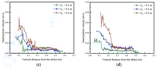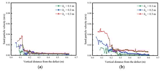 Figure 13 compares the migration velocities of the sand directly above the pipeline defect under different initial groundwater levels. In the early stage (t ≤ 5 s), particle migration is concentrated in the area near the defect; while in the area more than 0.1 m above the defect, the displacement rate is almost zero. As coupled seepage–erosion progresses, the disturbed zone expands vertically. By t = 15 s, the migration velocities of near-surface particles have increased by a factor of 2.8–4.5 compared to their initial values, indicating a systematic restructuring of seepage paths. At this stage, the soil particle velocity field exhibits a characteristic dual-zone mechanical response: in the below zone, the velocity field intensifies due to stress release; in the above zone, the soil layer remains relatively stable, with a low particle velocity.