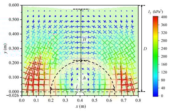 Through the DEM simulation, the direct interaction forces between soil particles can be analyzed, thereby enabling the analysis of the distribution and evolution process of stress in the soil layers, as shown in Figure 14. The color mapping is governed by the second deviatoric stress invariant I2, with cross symbols denoting the orientation of principal stresses (longer arms indicate the direction of the major principal stress) and their relative magnitudes (cross-arm length is proportional to the trajectories of the stress tensor) [].