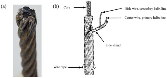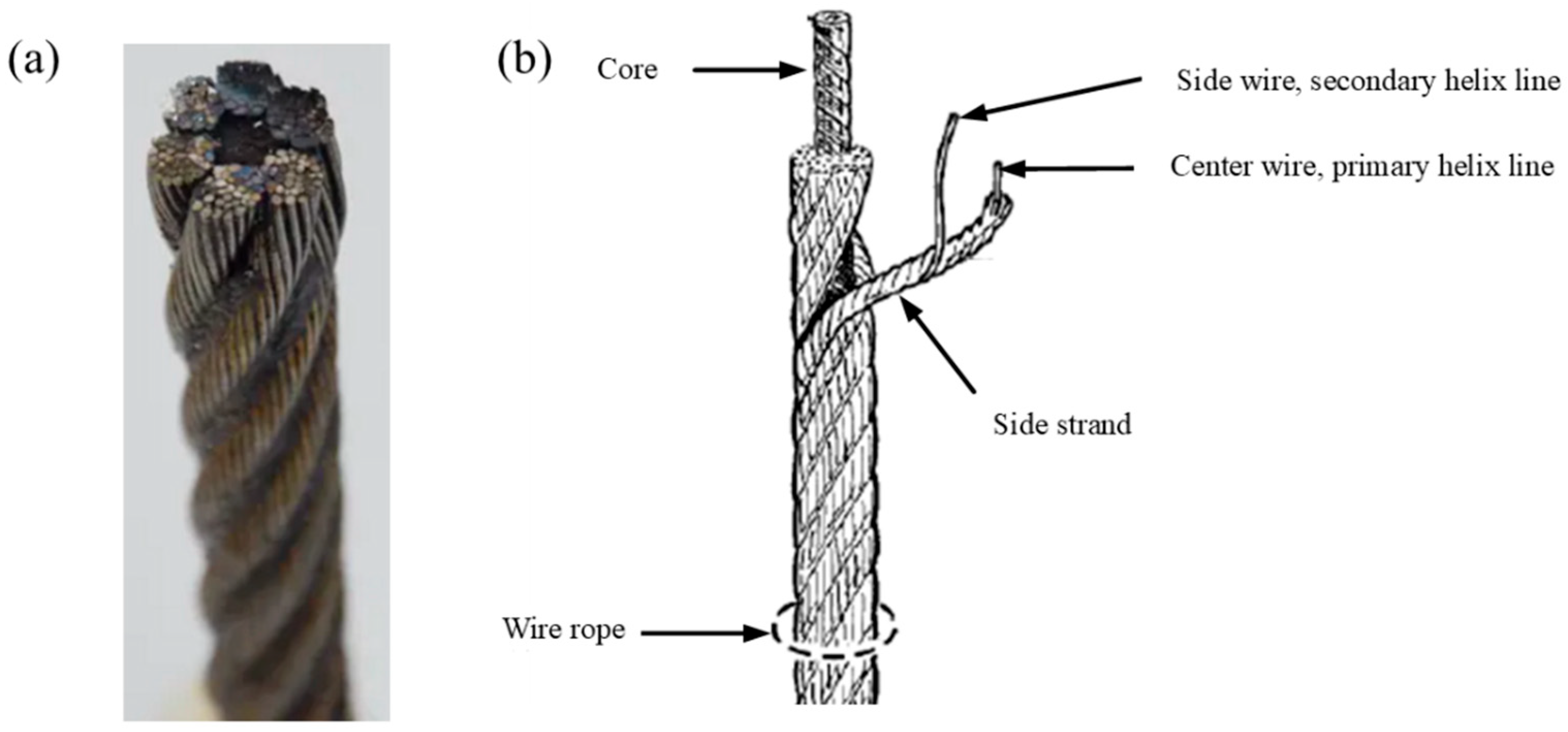 The wire rope. (a) Physical picture. (b) The spiral distribution map of the steel wires in the steel wire rope.