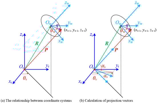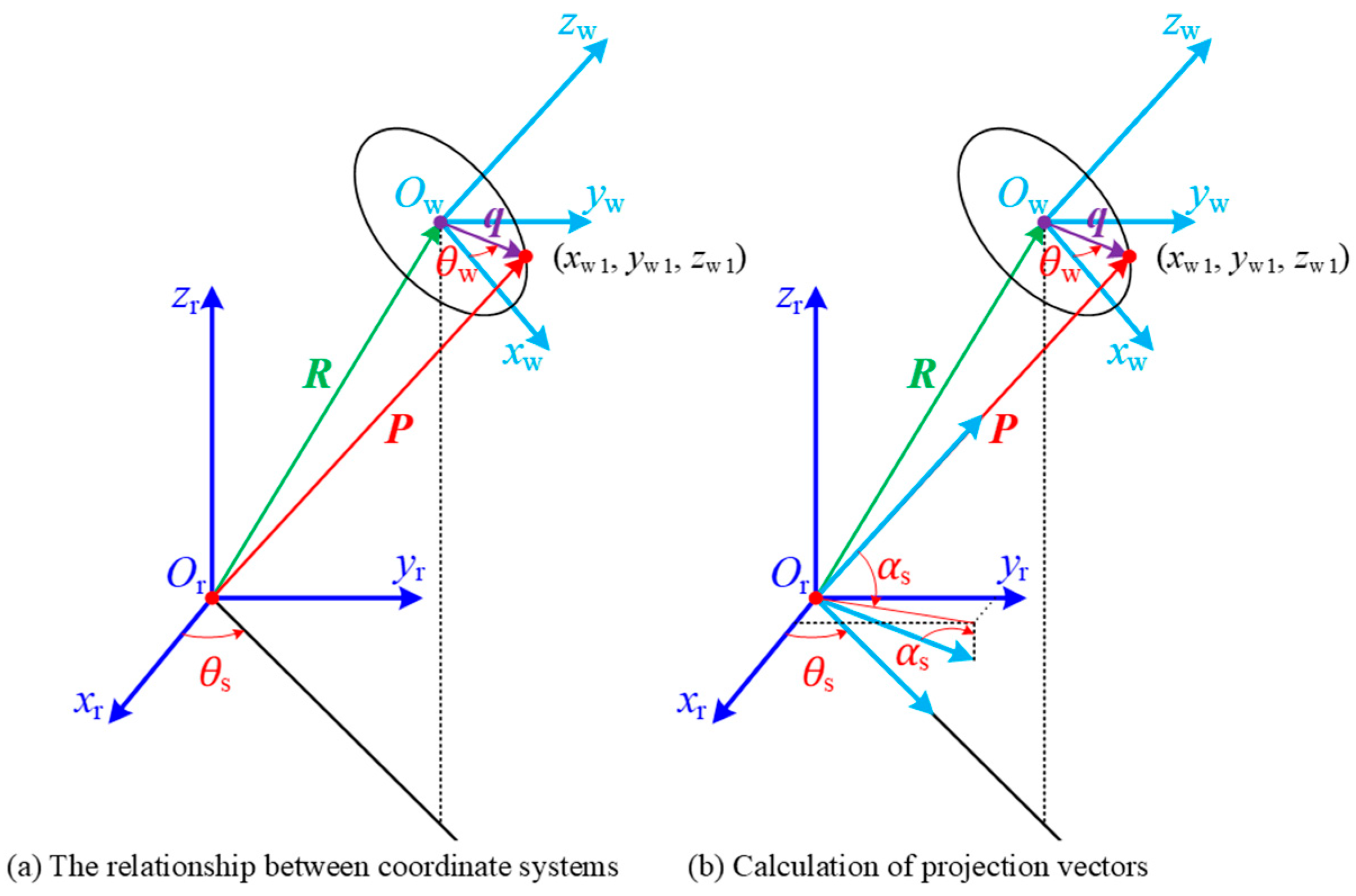 Since vector q lies on the coordinate plane, therefore zw1 = 0. Here, the coordinate components (xw1, yw1) can be obtained from Equation (4). Also, since vector R points to the starting point of vector q, vector P can be obtained by vector summation, that is: