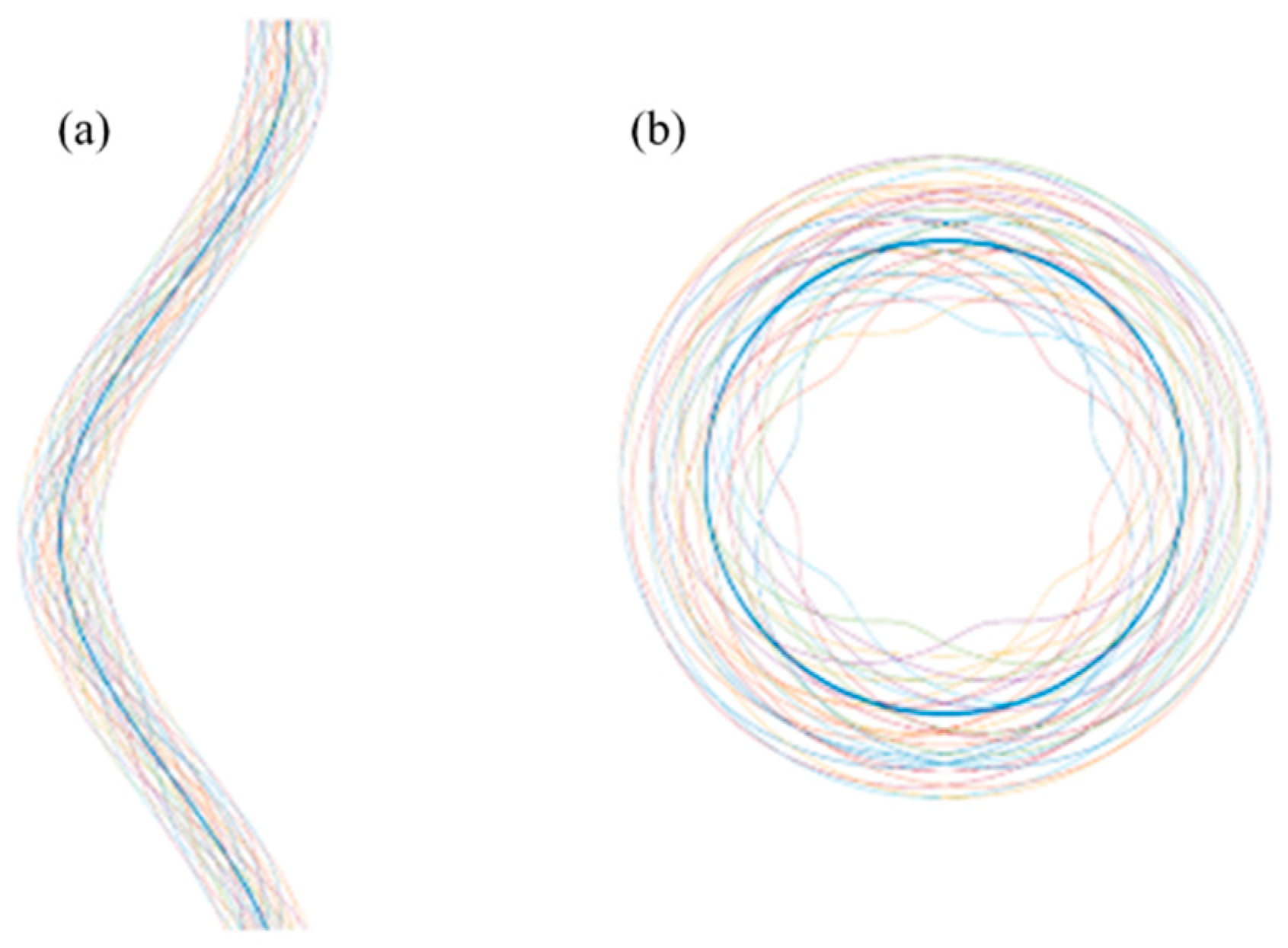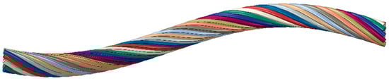 Using the mathematical model of the steel wire centerline obtained through the above derivation, programming was carried out in MATLAB R2019b to calculate the centerline coordinates of all the steel wires that constitute the steel wire rope. Based on the obtained coordinate points, the centerline of the sling steel wire was fitted and generated as shown in Figure 4.